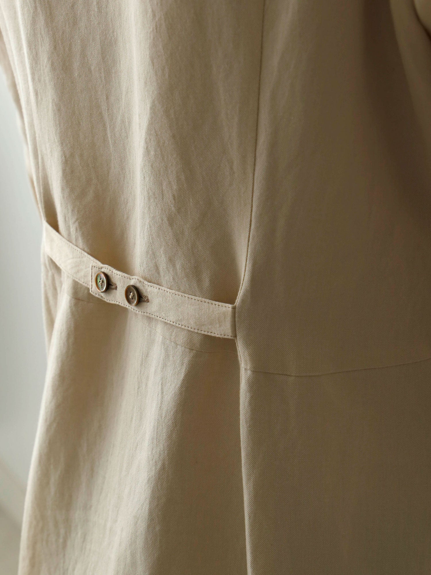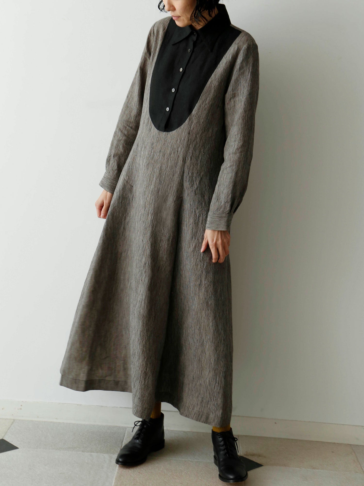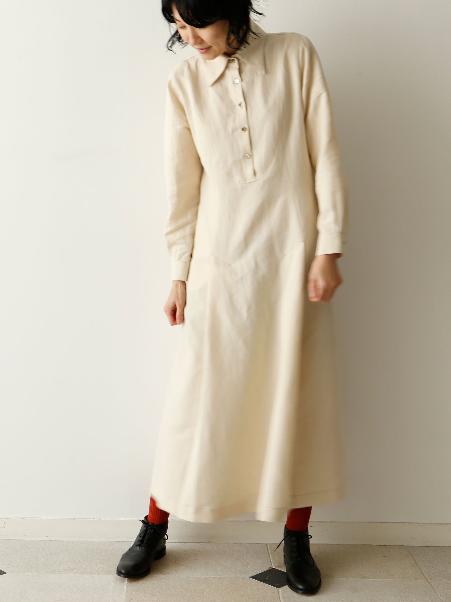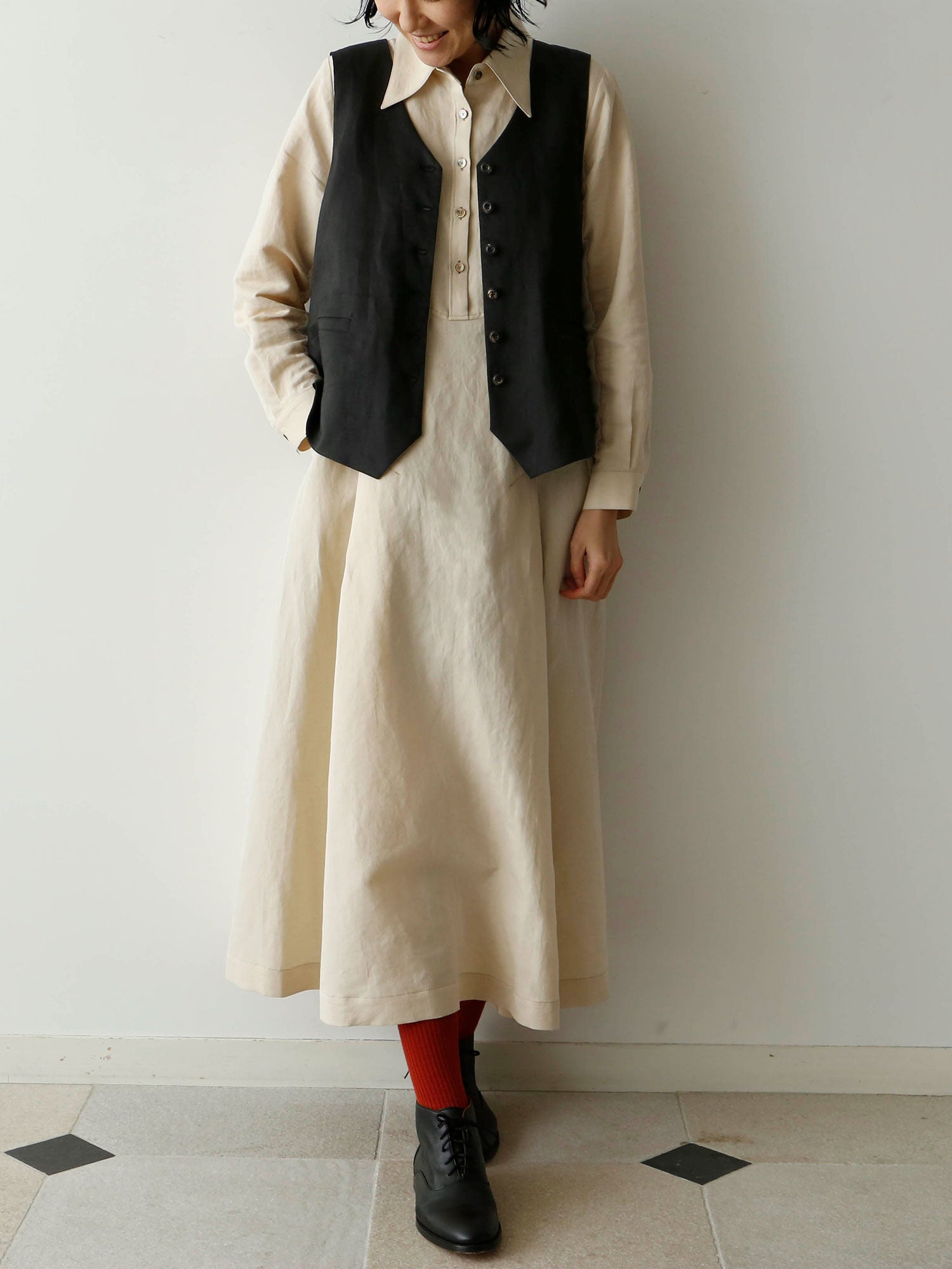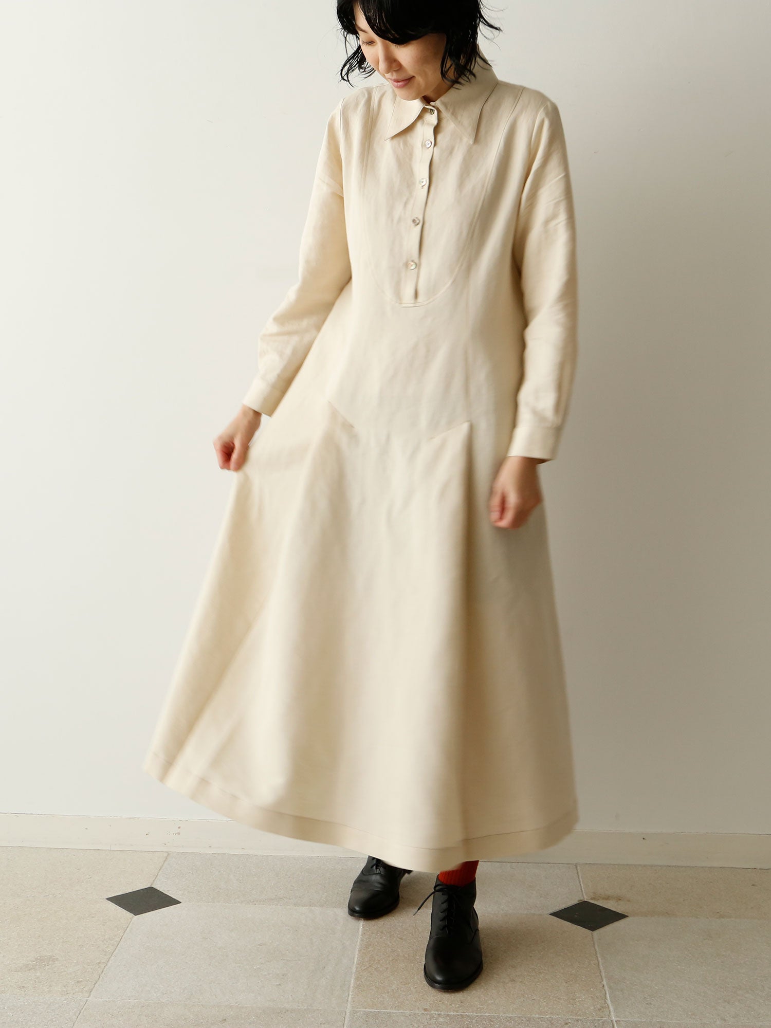 やわらかく優しい色合いの、リネンコットンで仕立てた襟付のワンピース。上半身は細見えを叶えるすっきりとしたライン。スカート部分はタックプリーツをとることで、たっぷりと優雅に広がります。これかの季節のお出かけにちょうどいいワンピースです。