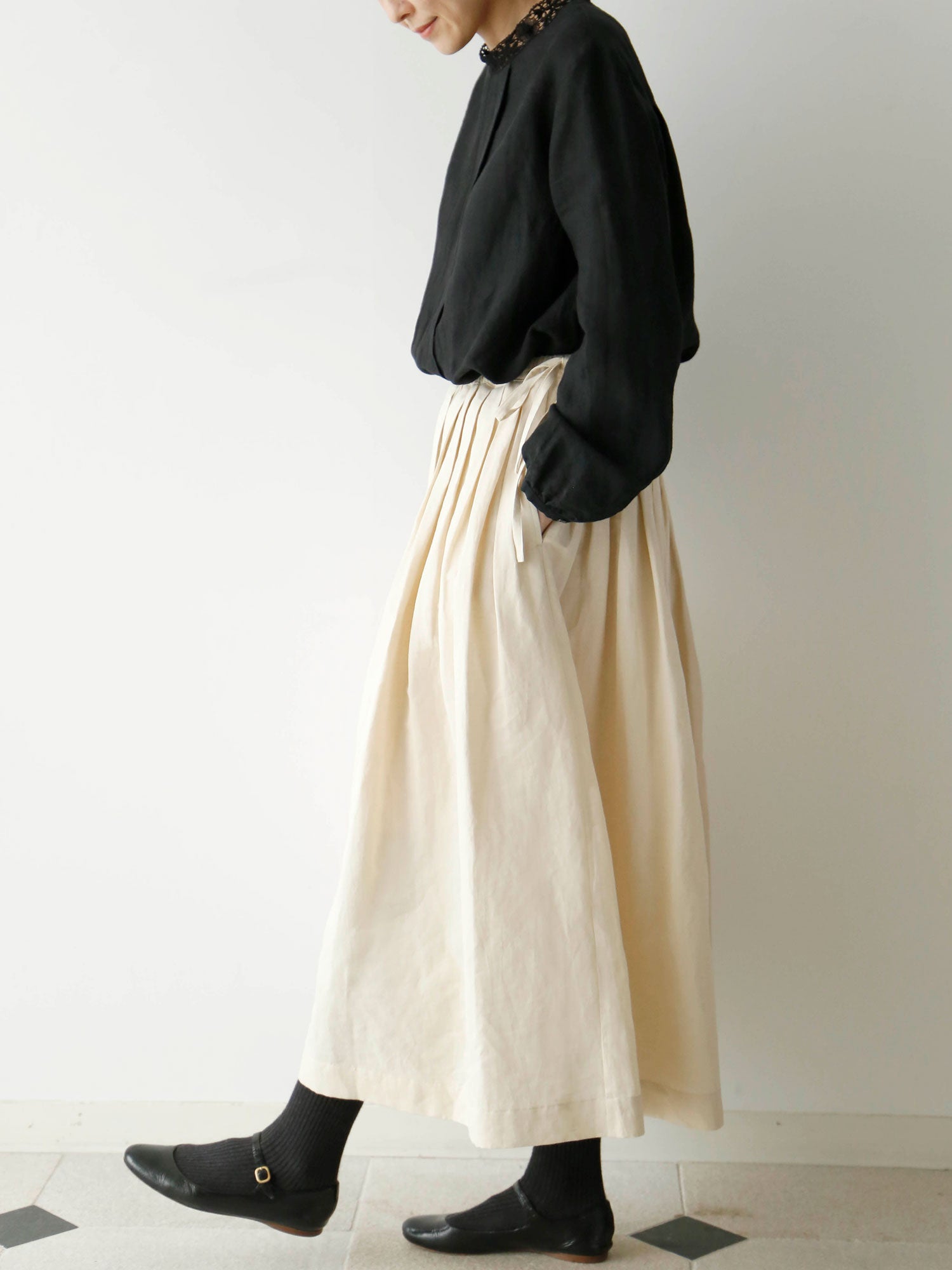 前2箇所にはタックプリーツが施されているデザイン。立体感がうまれ、裾に向かってたっぷりと広がるラインが優雅です。