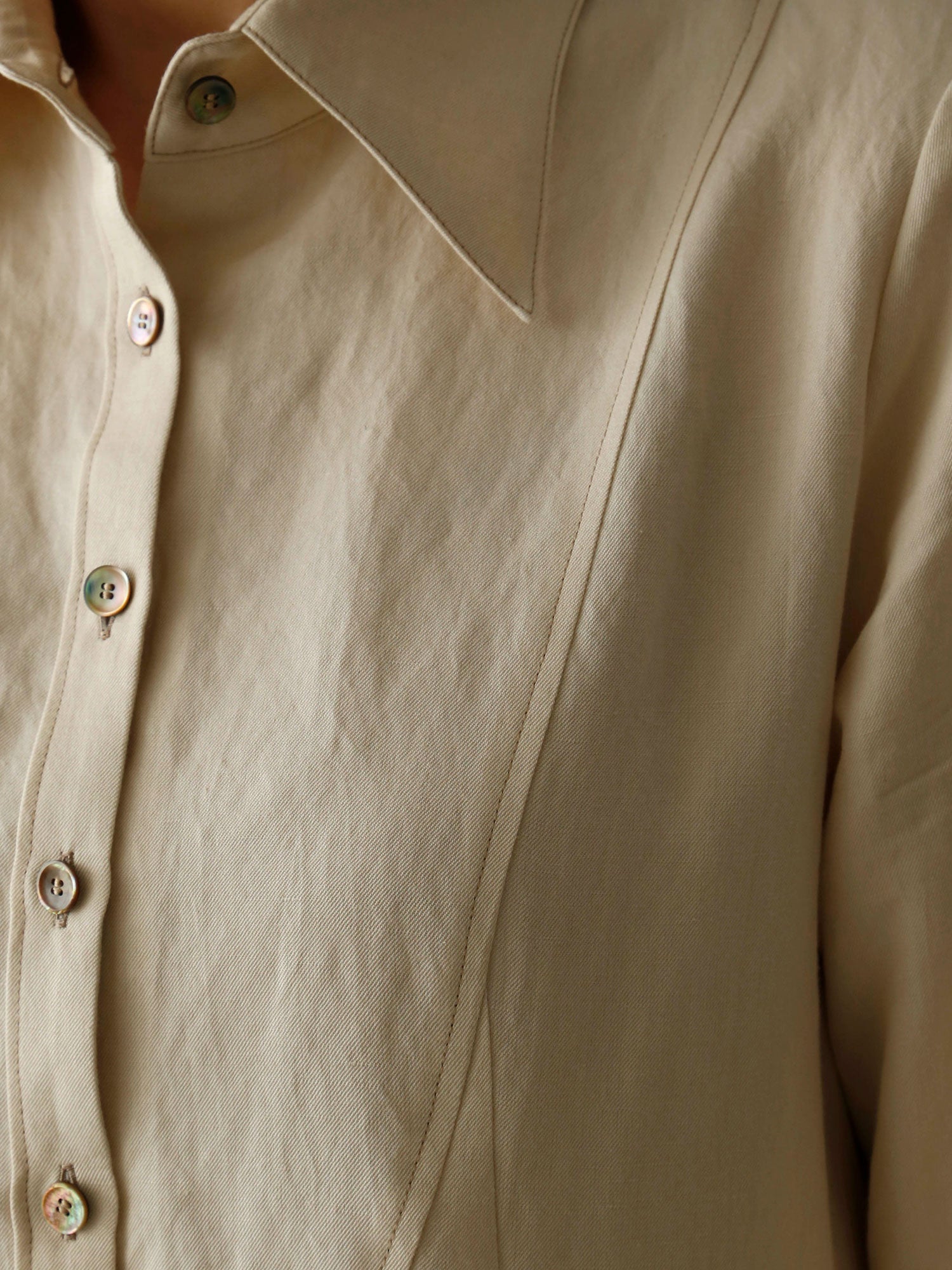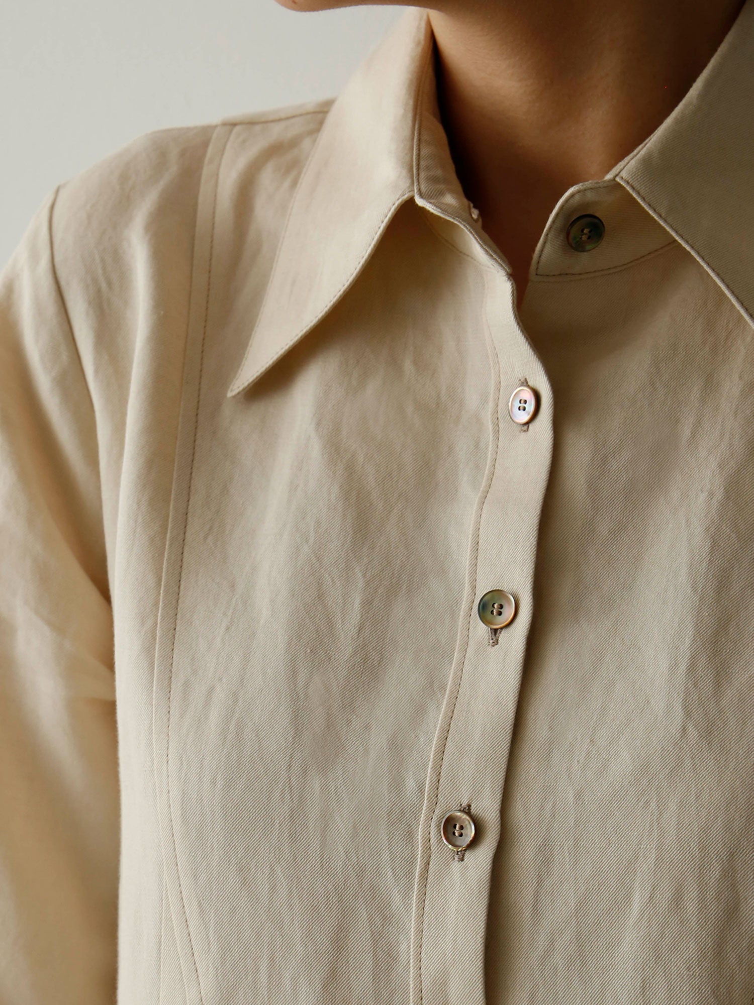 立体的な台襟付の襟が、柔らかなトーンを引き締めて、大人っぽく上品な印象に。フロントヨークの曲線を描く丸いラインが、シャープな襟先を女性らしく見せてくれます。