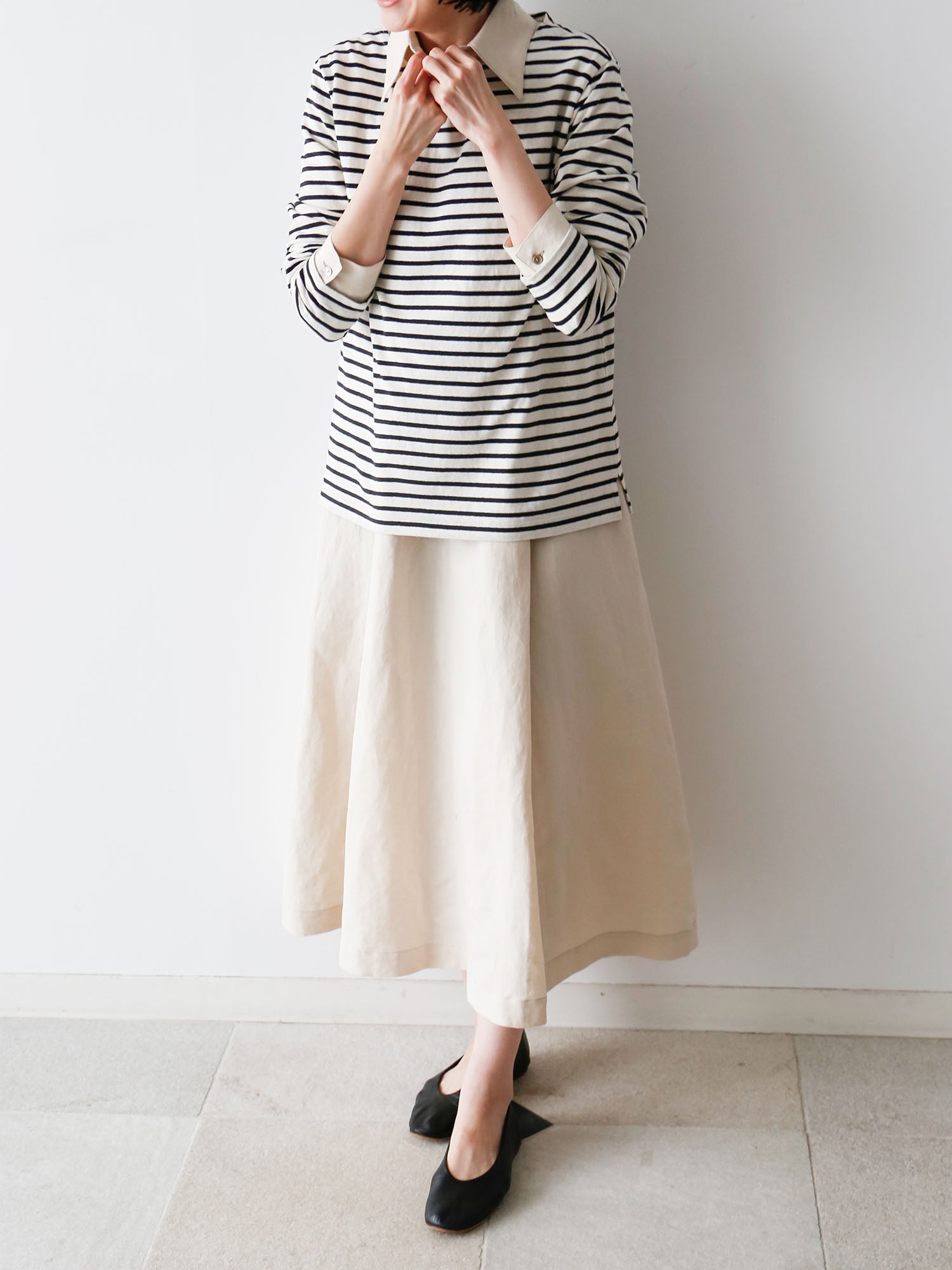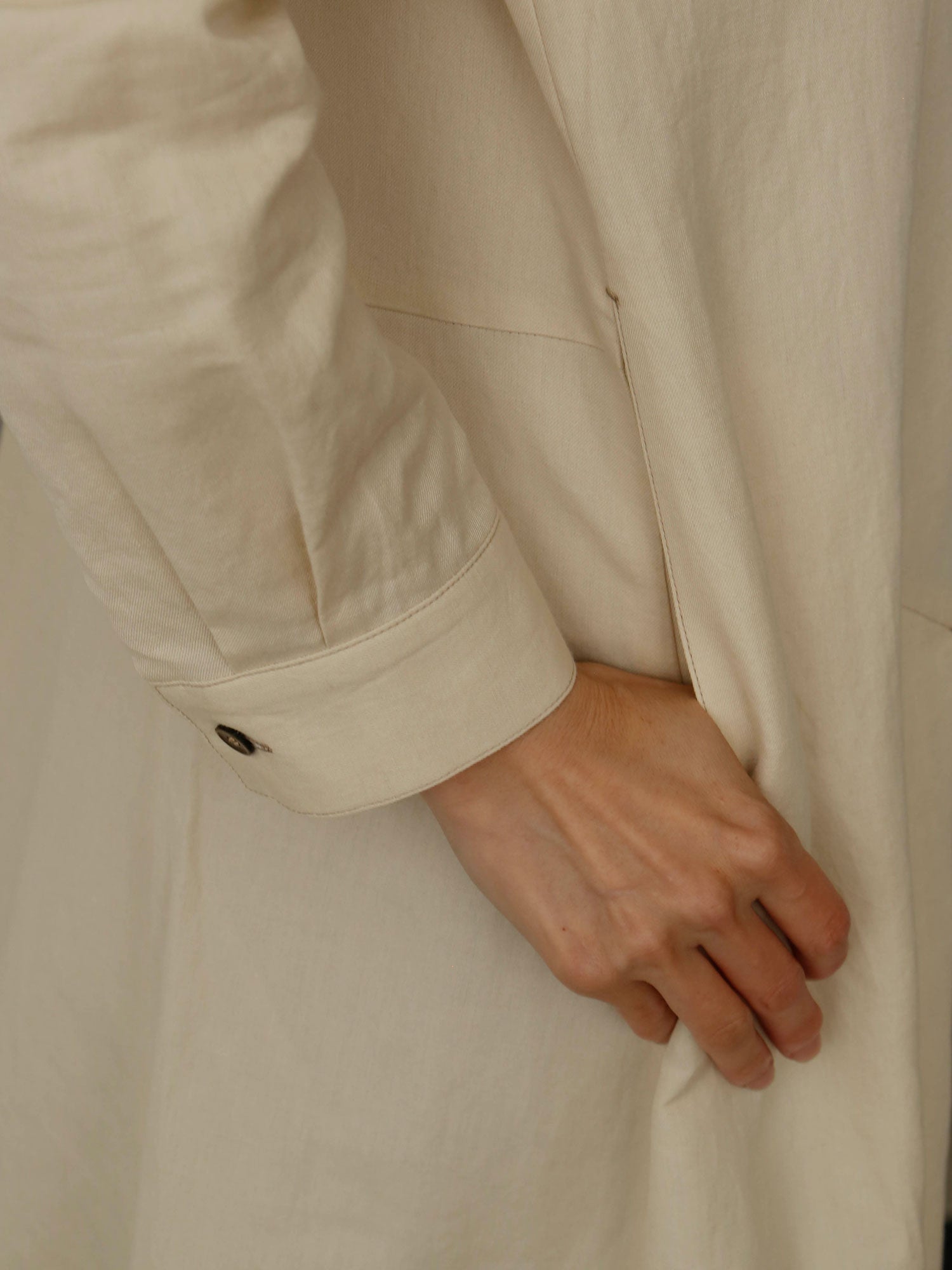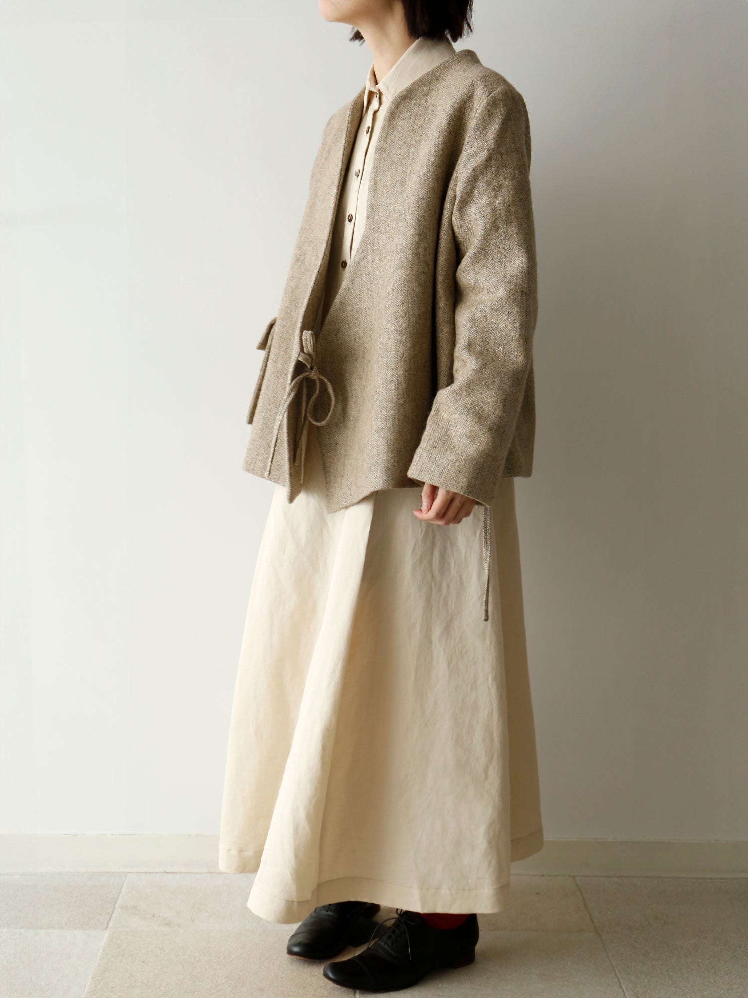 素材は尾州産のリネンコットン。リネンの柔らかな肌触りと、コットンの程よい厚みがある生地感で、春秋冬と3シーズン着まわせます。