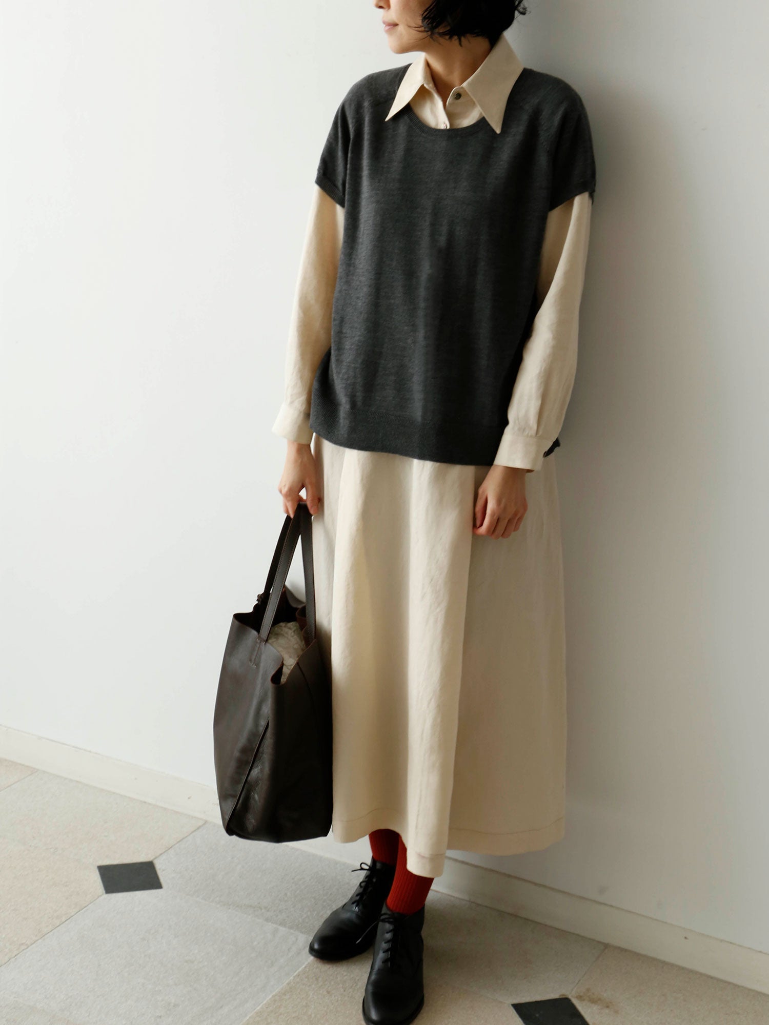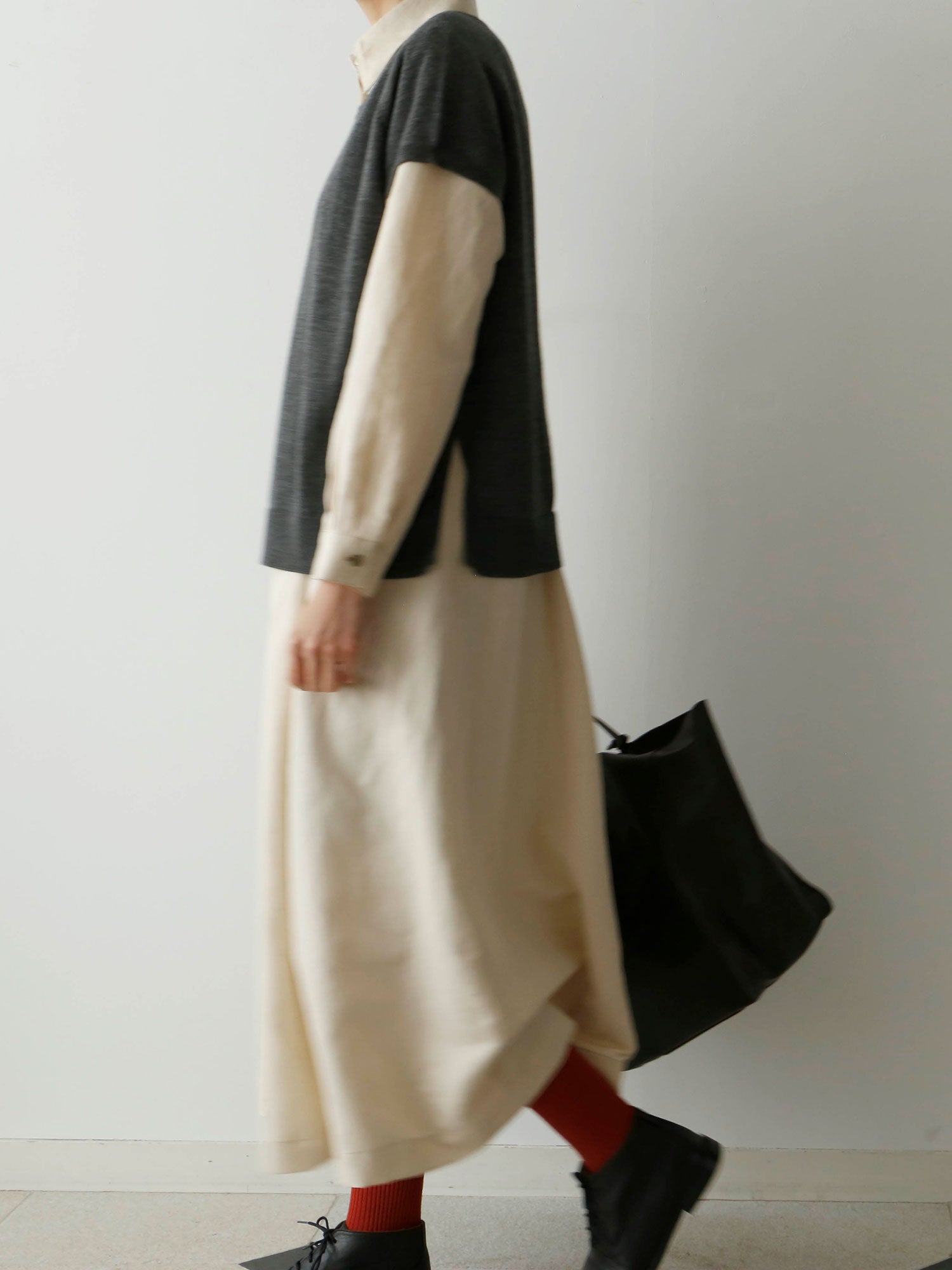 程よい厚みの生地感で、一枚でコーディネートが決まる便利なワンピースですが、スッキリとしたラインで、重ね着にも重宝します。ニットを重ねたりアウターを羽織ったり、もたつきや着崩れがなく綺麗に着こなせます。