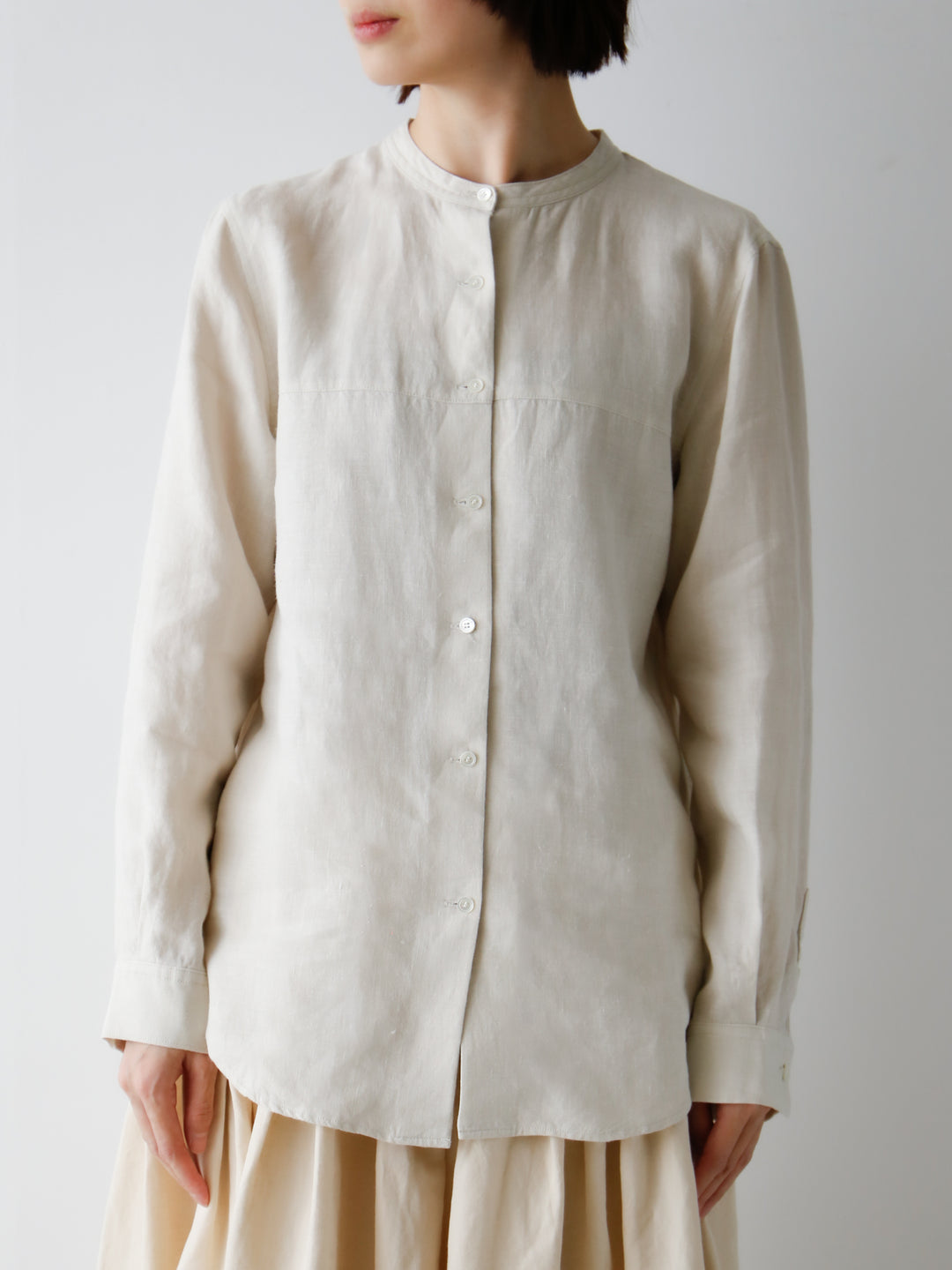 女性がすっきりと着られるスタンドカラーのシャツ「ボドワン」が素材を変えて入荷しました。素材はリネンでリゼッタらしく、アウターに響かないから着回しのきく一枚です。
