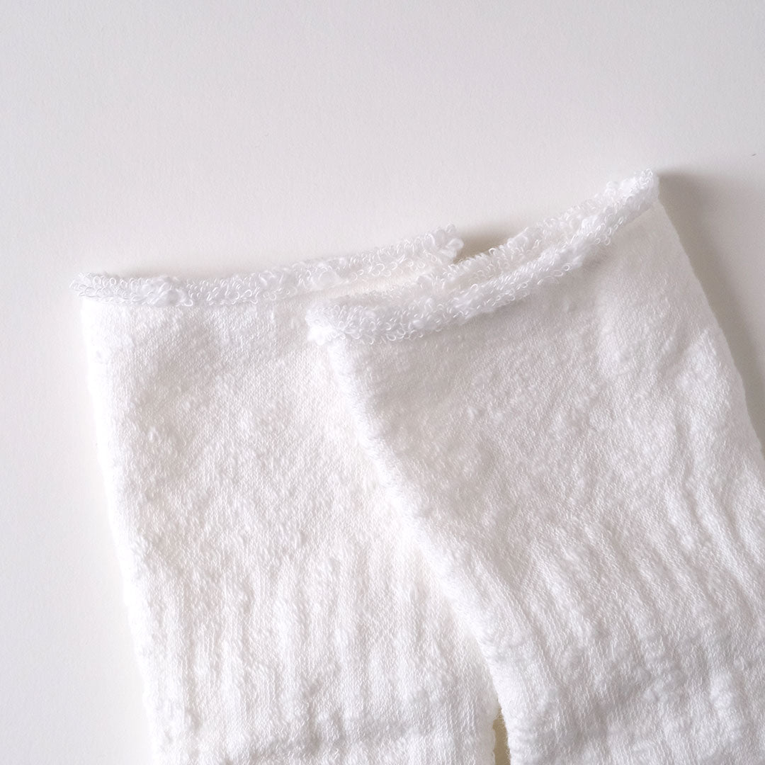 WALKING SOCKSの素材は綿77%, ポリエステル19%, ポリウレタン3%, ナイロン1%。空気をたっぷりと含んだ、パイル地ならではの包み込まれるようなやさしい肌触り。そして、ごろつきやざらつきが少ないスムーズな履き心地です。靴下編み機でつくるため、いわゆるタオル地より密度が高く足に気持ちよくフィットします。歩いたりちょっとした運動時の衝撃から足を守ってくれるので、歩き疲れが軽減します。