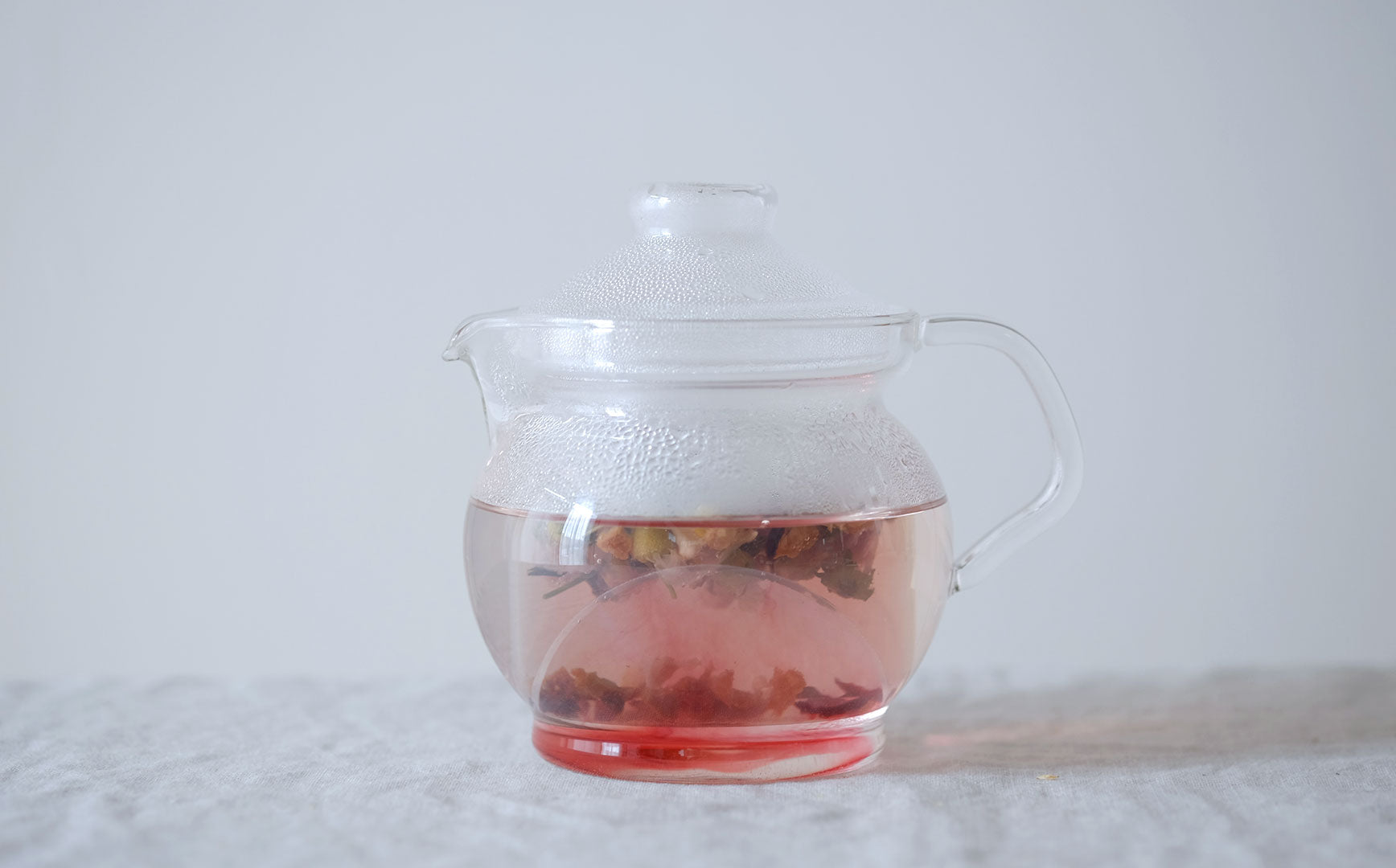 蒸気でくもったガラスポットの中で移り変わる植物の色。湯気とともに立ち上る深呼吸したくなる植物の香り。