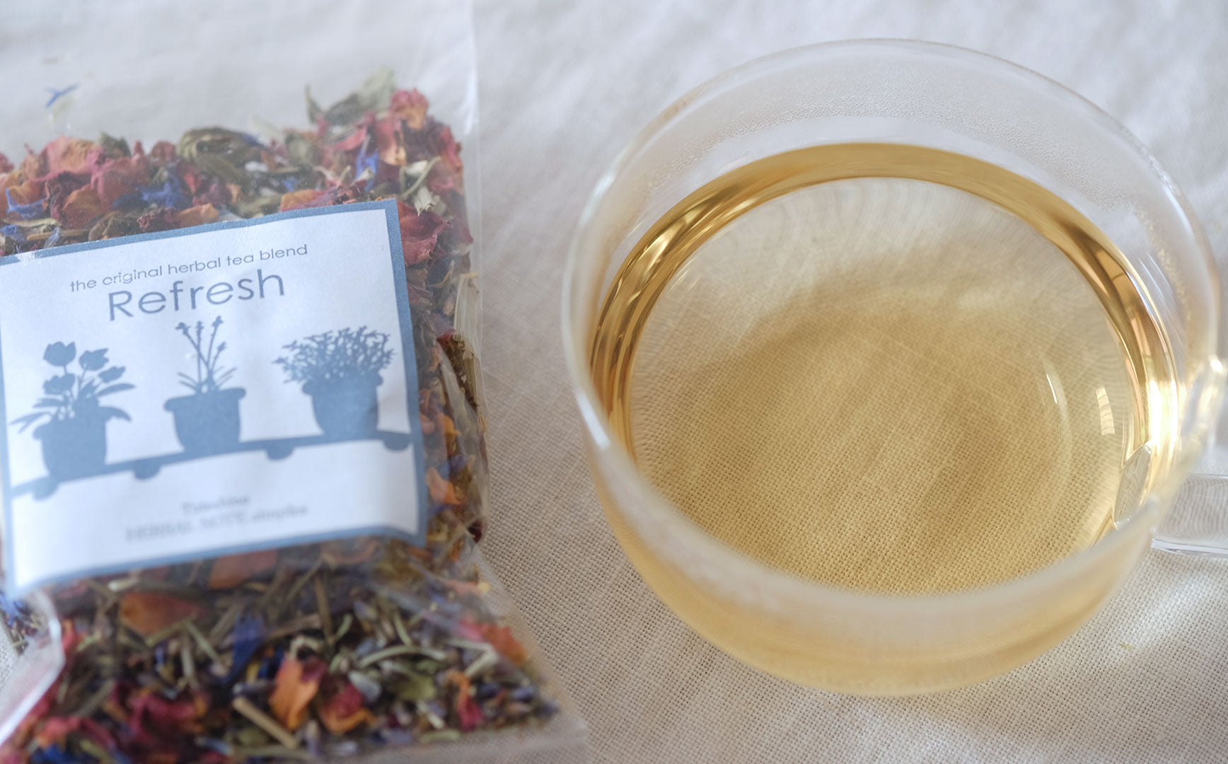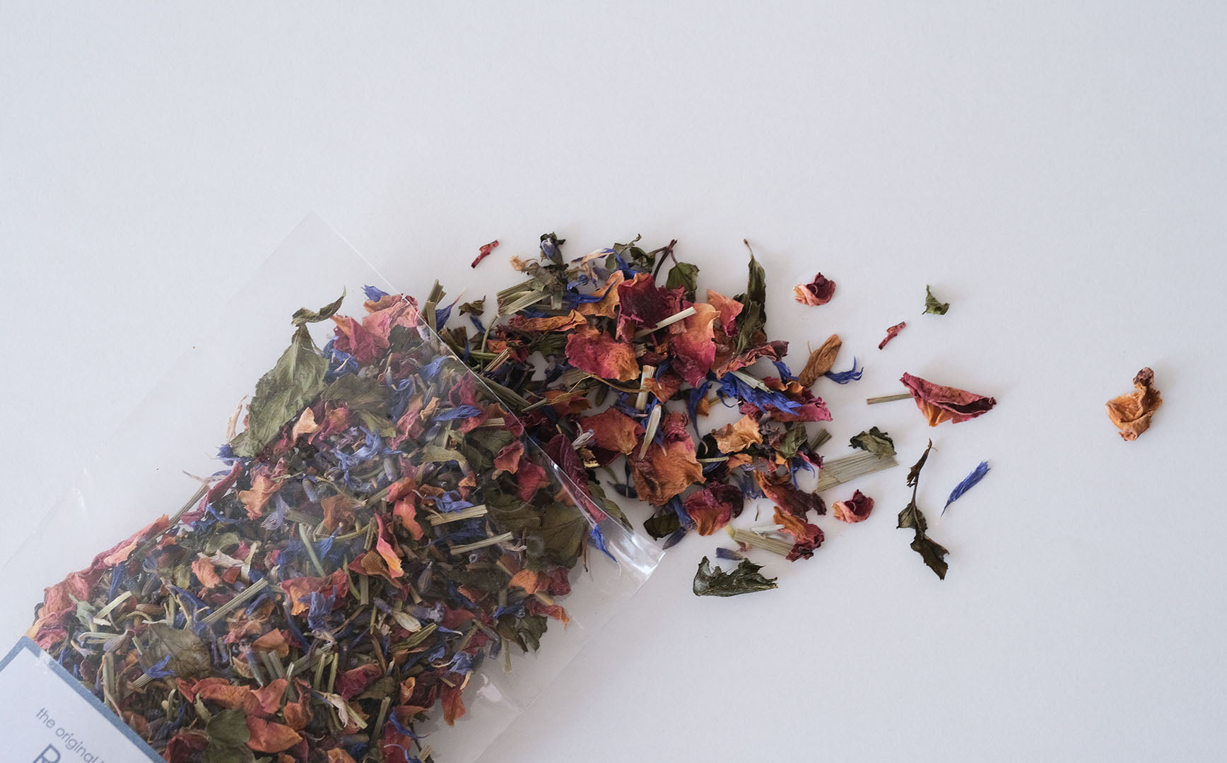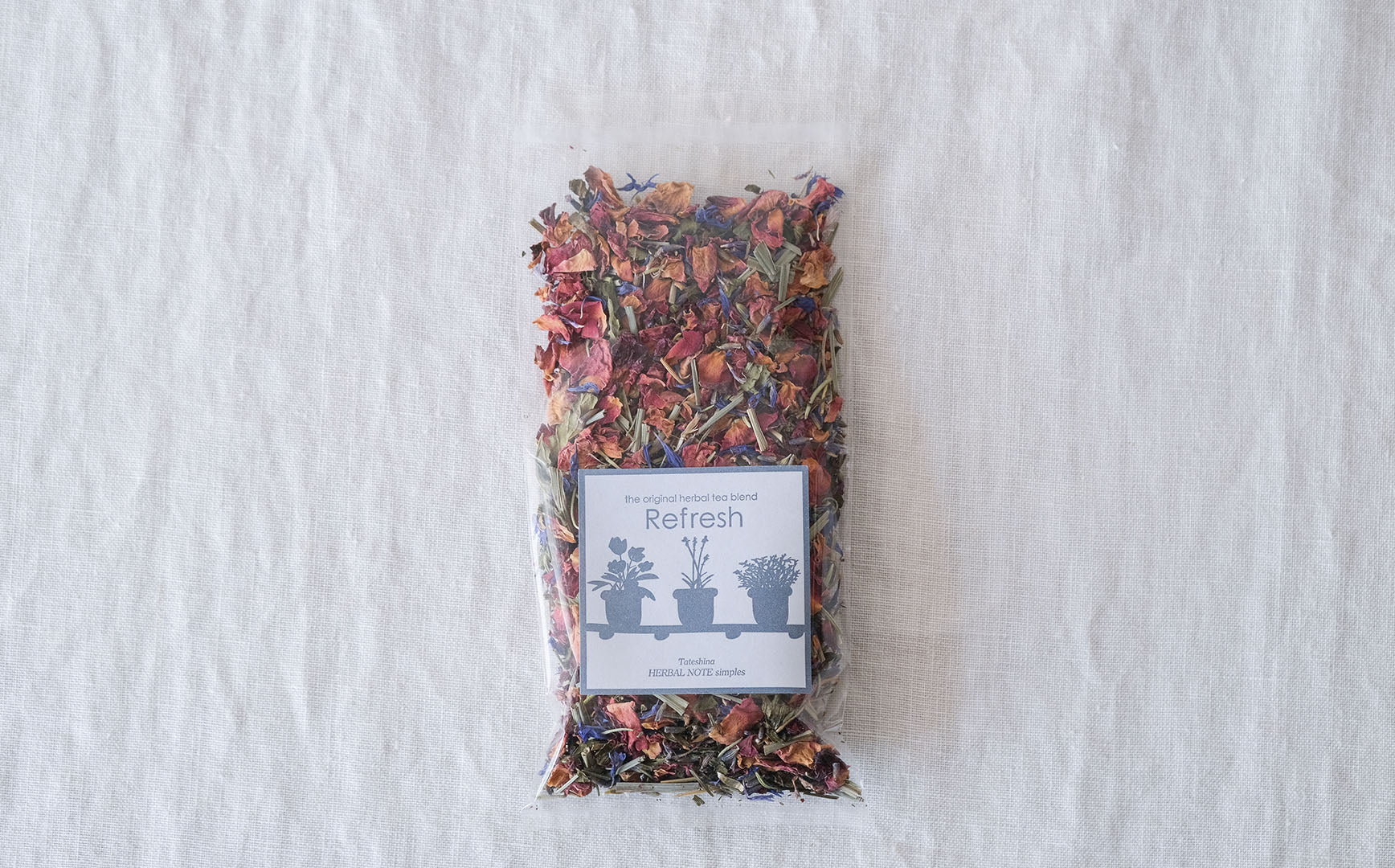 レッドローズ、ラベンダー、ローズマリー、タイム、ペパーミント、レモングラス、コーンフラワーとさまざなハーブがミックスされた「リフレッシュ」。