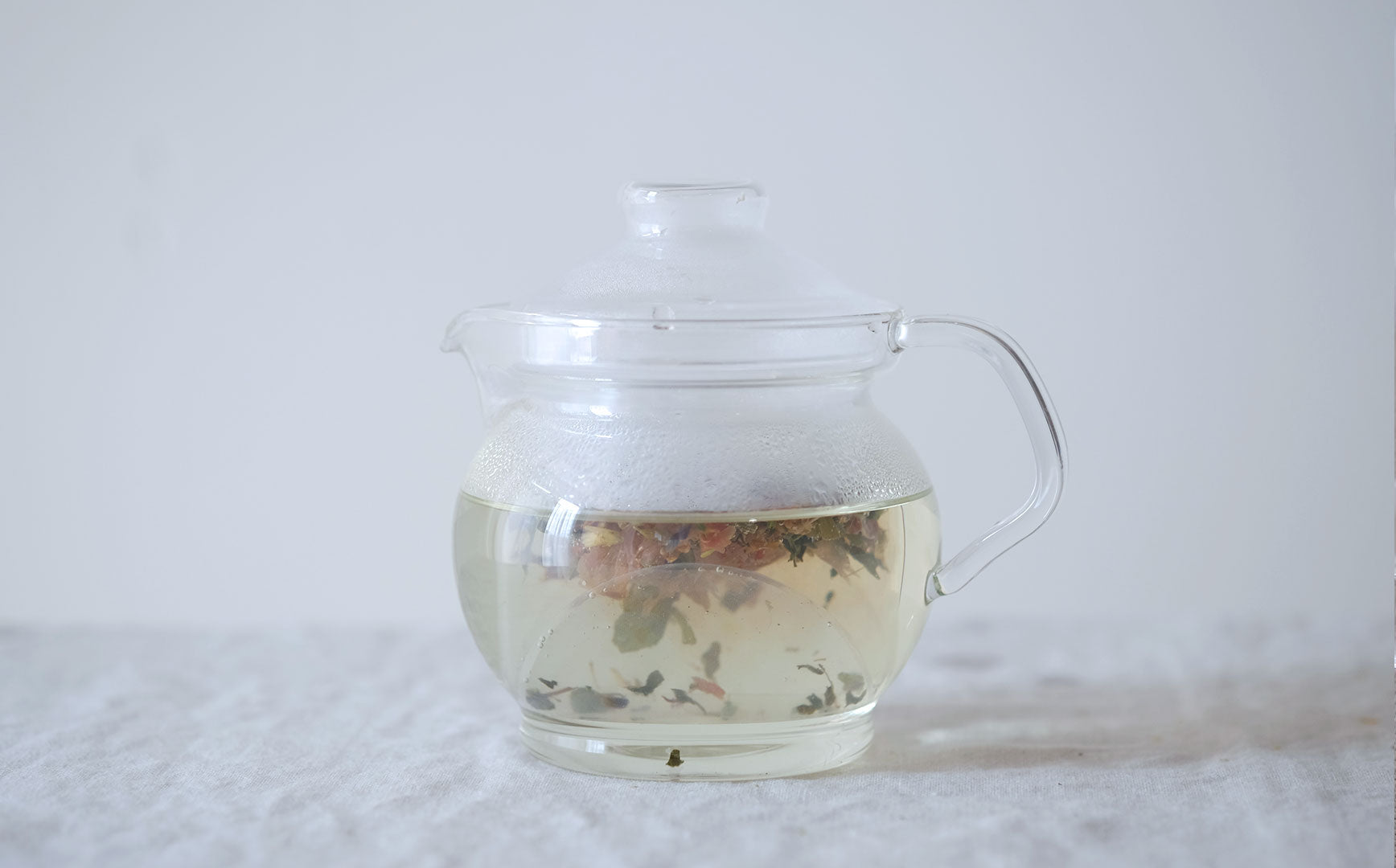 蒸気でくもったガラスポットの中で移り変わる植物の色。湯気とともに立ち上る深呼吸したくなる植物の香り。