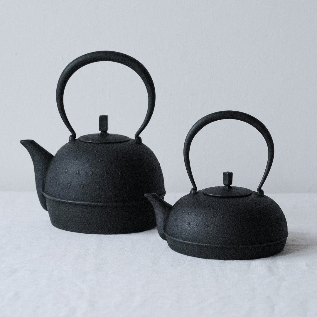 ドットのように可憐な伝統柄あられと黒の組み合わせがクールな印象の南部鉄瓶「Sayu」。キッチンやお部屋に置いても、空間を引き締め、凛々しくたたずむ様子が素敵です。