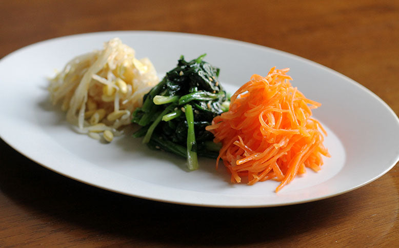 茹でた野菜(人参、ほうれん草、豆もやし)に、塩、すりおろしたニンニクを加え、手で和え、仕上げに胡麻油を垂らします。おいしくつくるポイントは、手を使って和えることと胡麻油を最後に入れること。