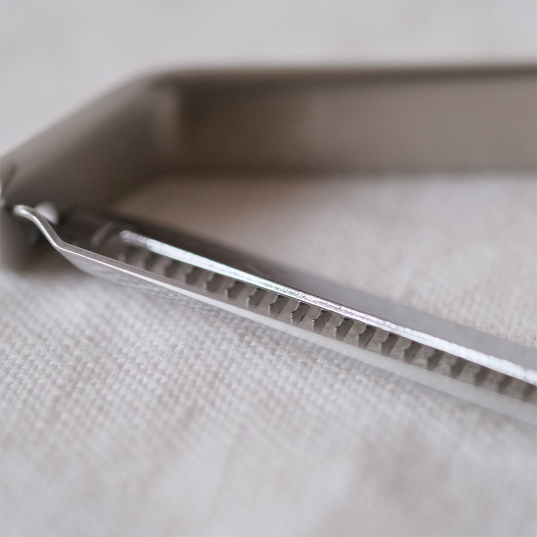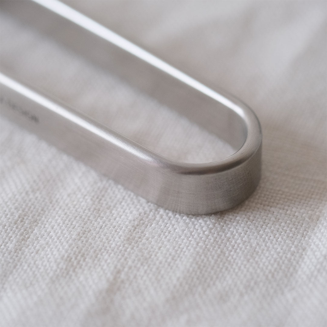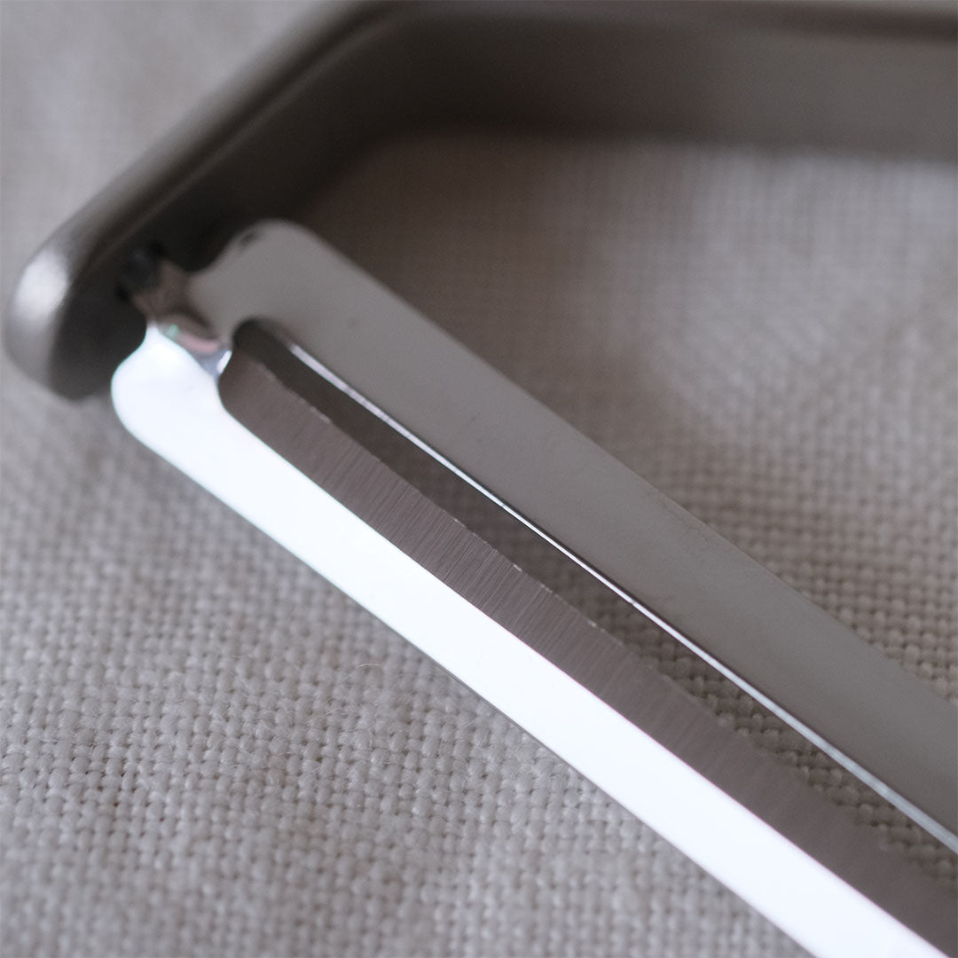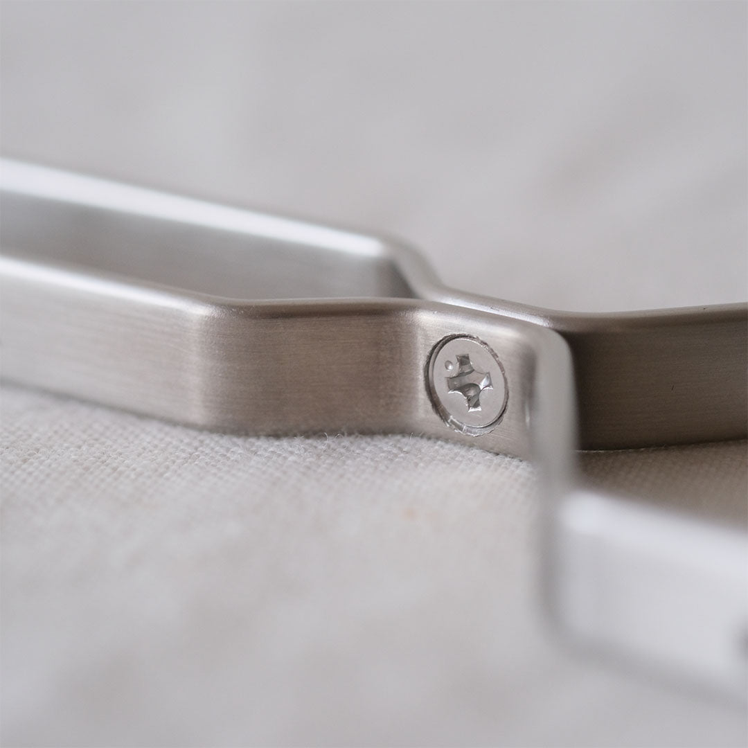 シンプルなフレームのつくり。棒状のステンレス材を平らにプレスし、機械で折り曲げ加工されています。