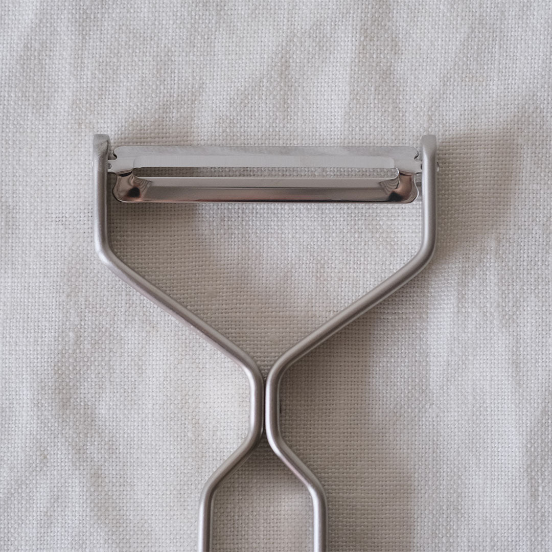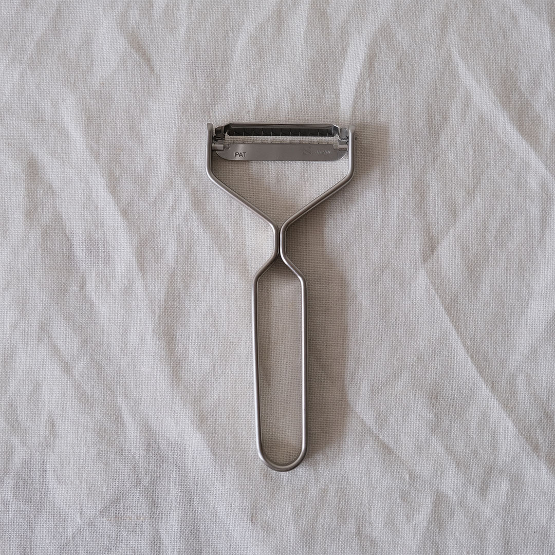これは野菜の皮むきのためのお決まりのピーラー。皮を剥くように平面にむくことができます。