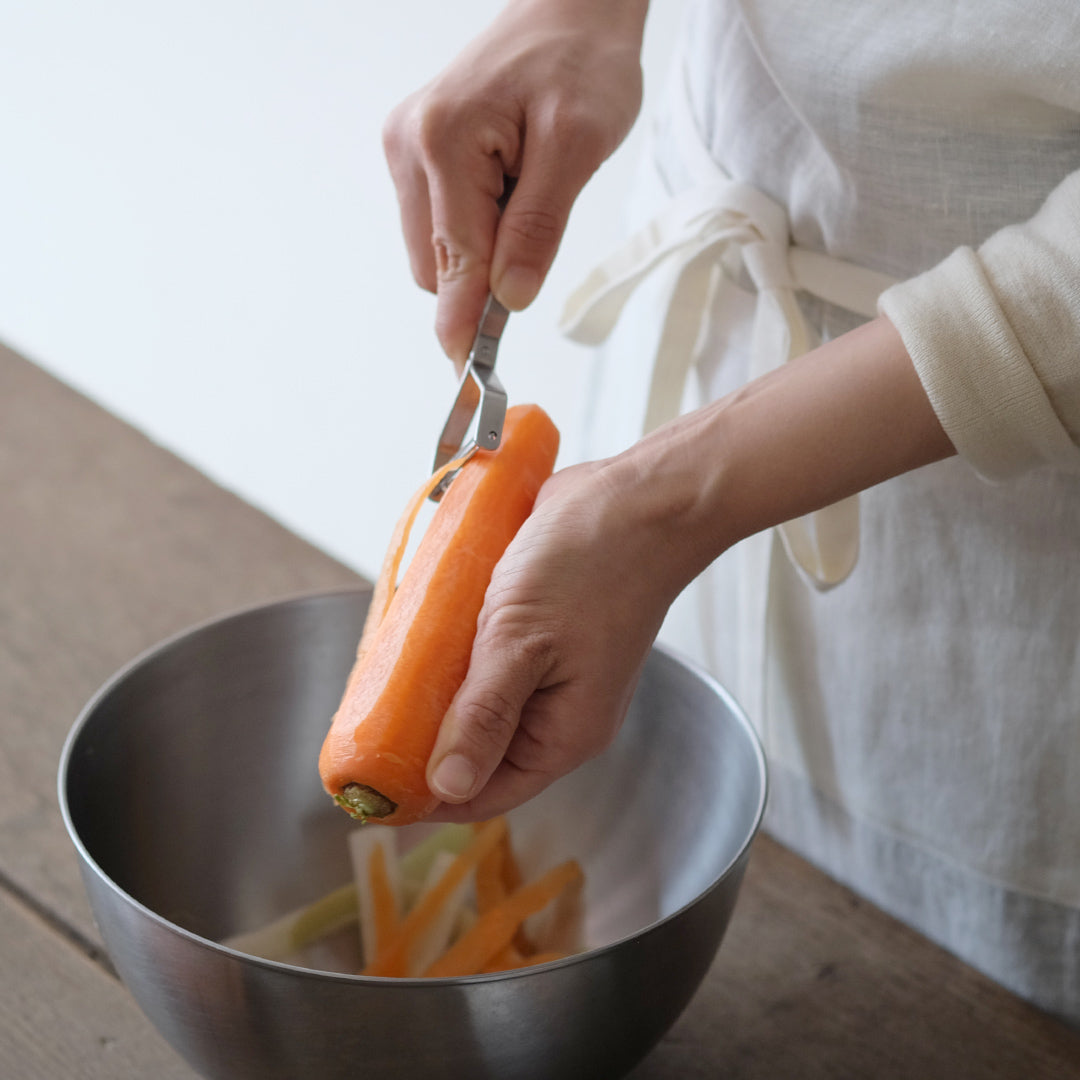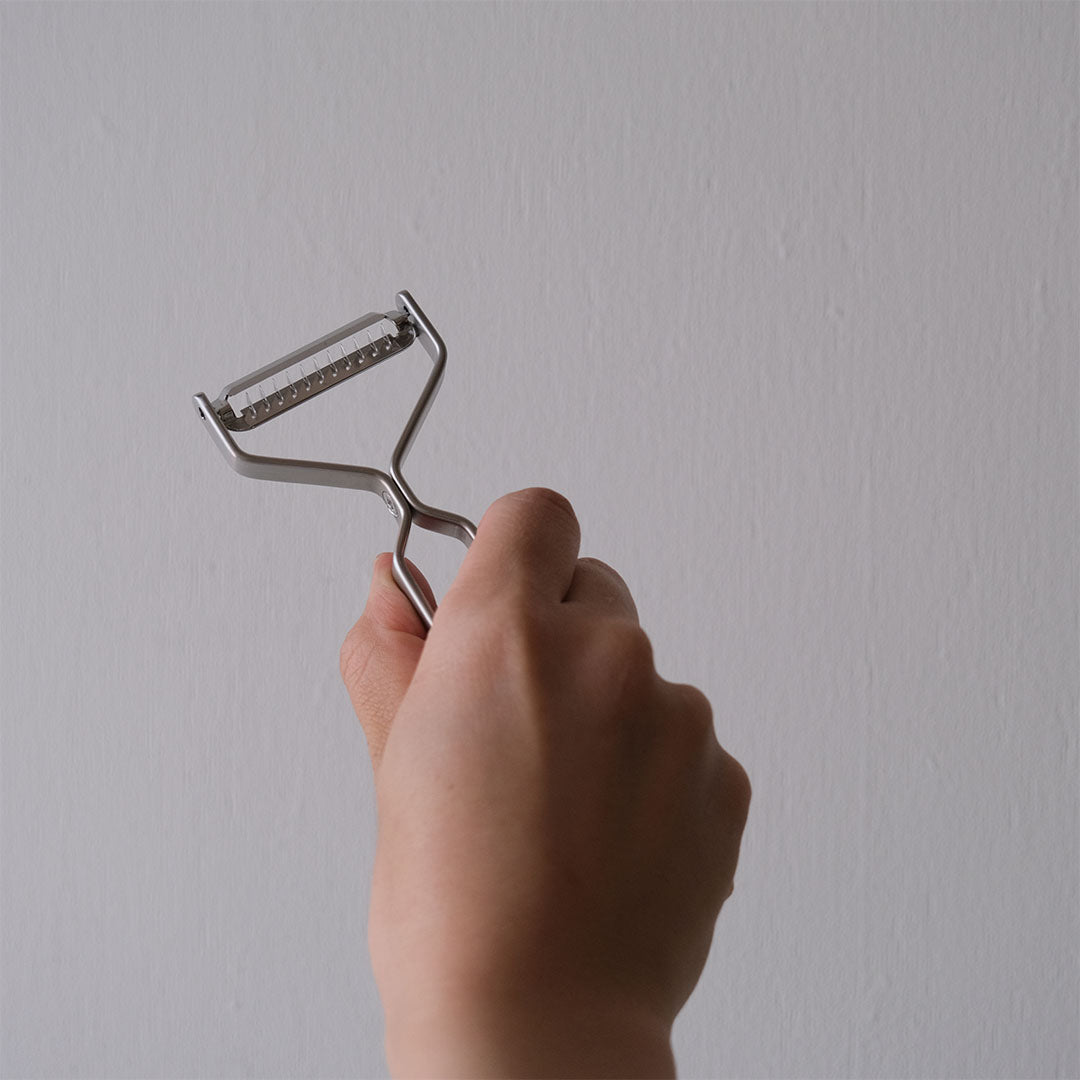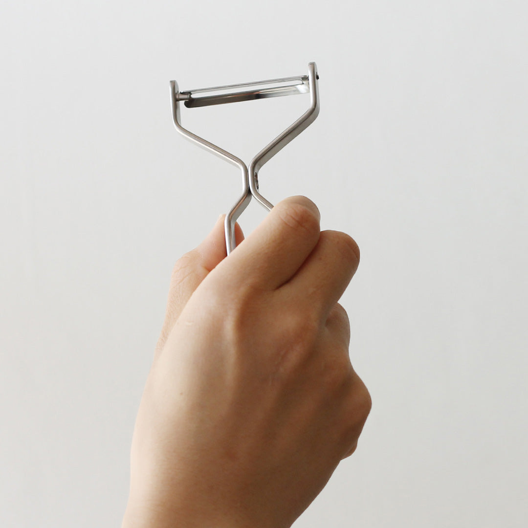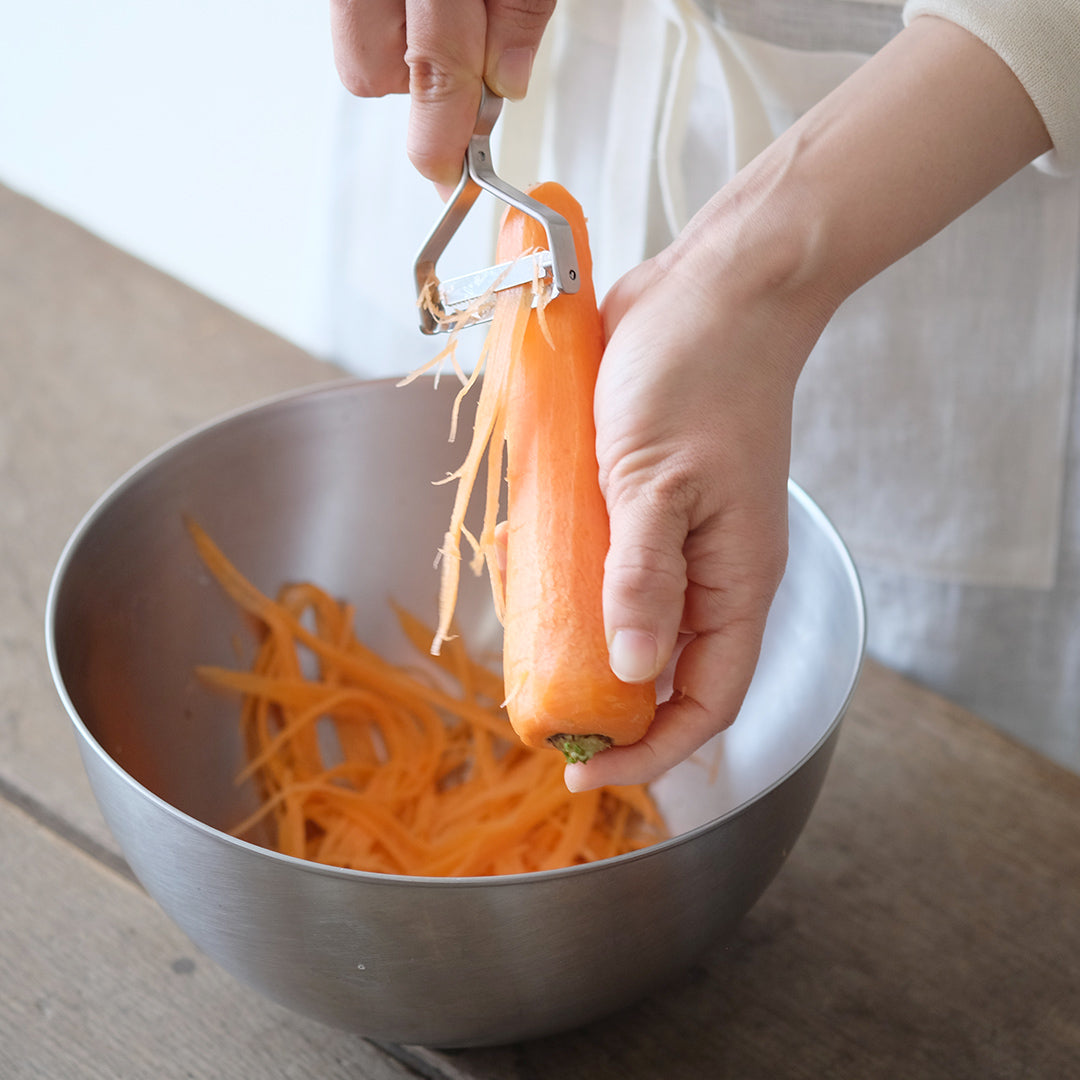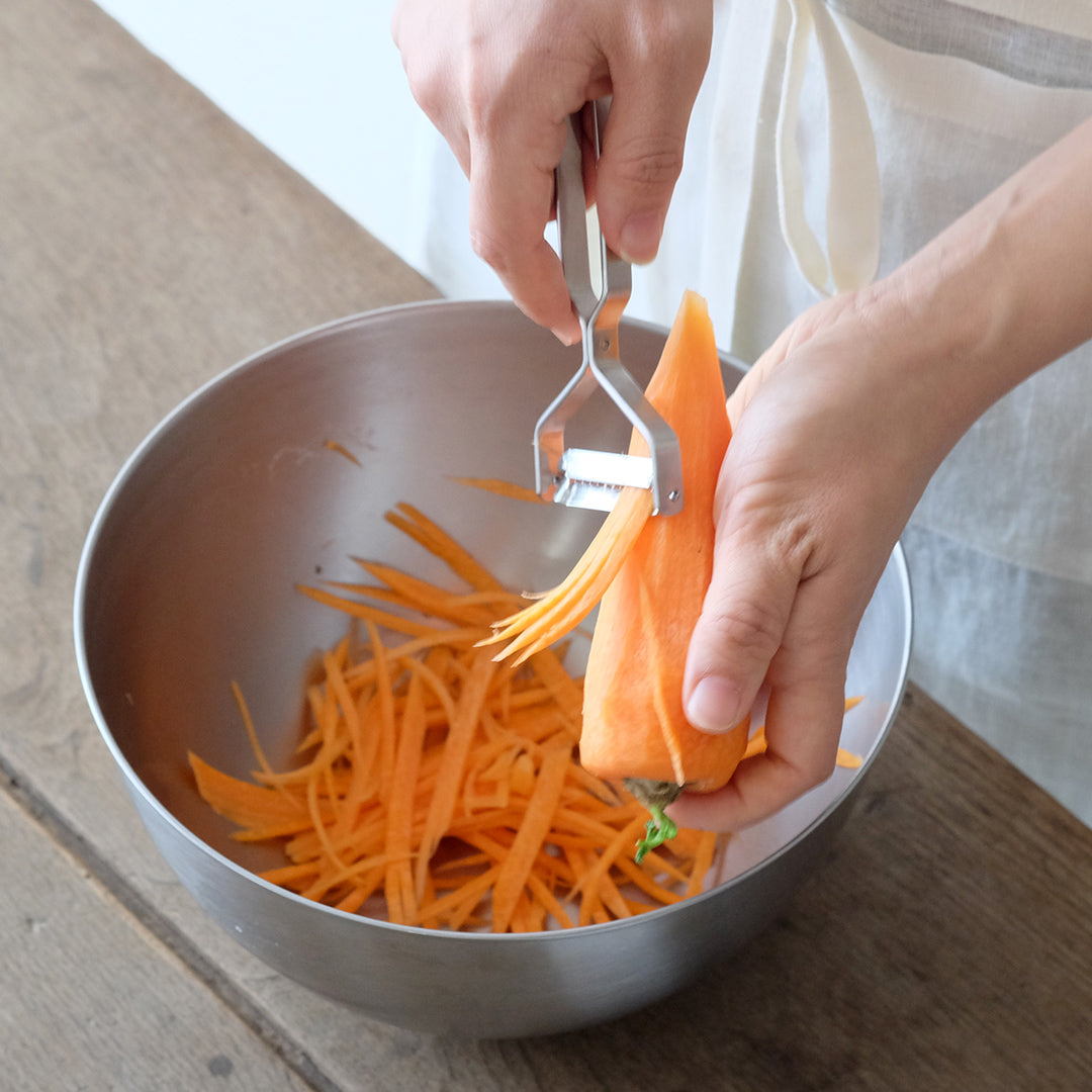 人につい話したくなるヨシタ手工業デザイン室のピーラー。馴染みのある「むく」という方法でスルスルと野菜が刻めて、料理を1品完成させてくれる優れものです。