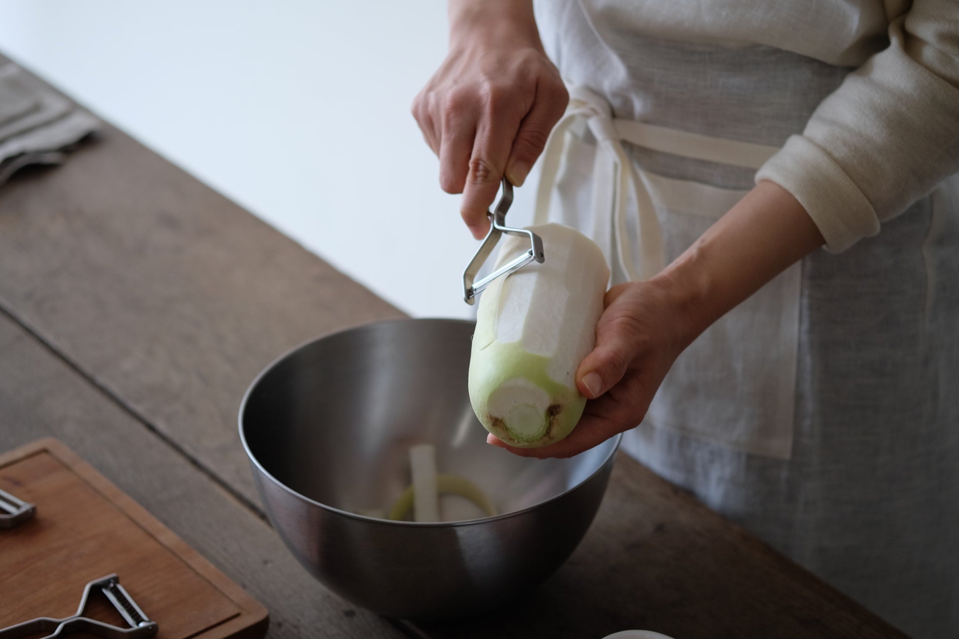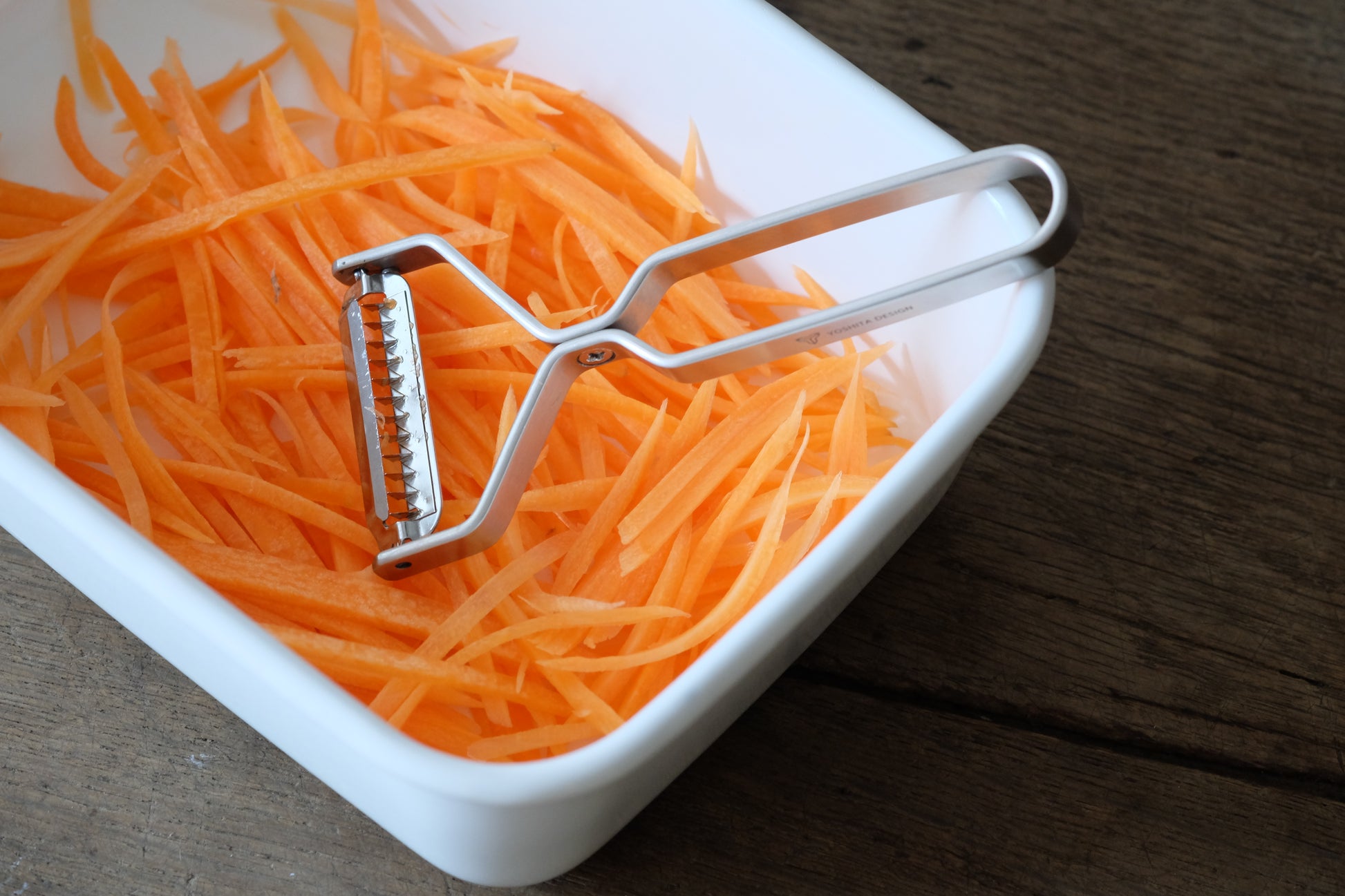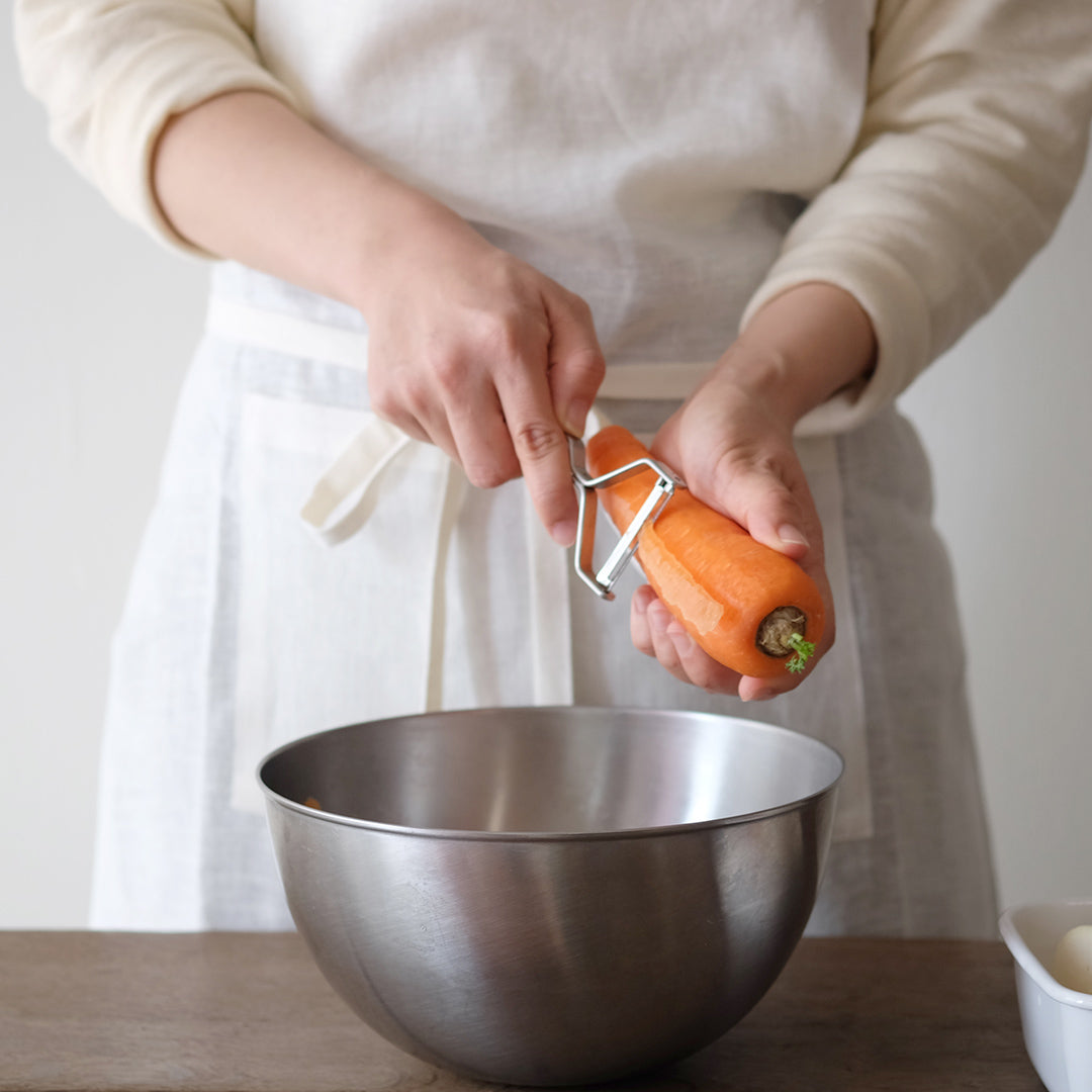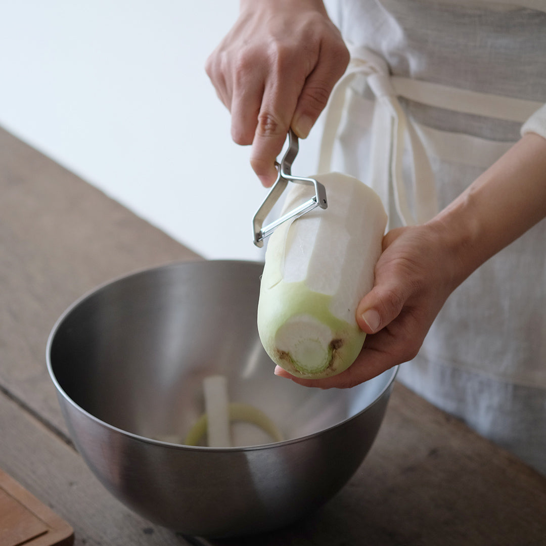 人につい話したくなるヨシタ手工業デザイン室のピーラー。馴染みのある「むく」という方法でスルスルと野菜が刻めて、料理を1品完成させてくれる優れものです。