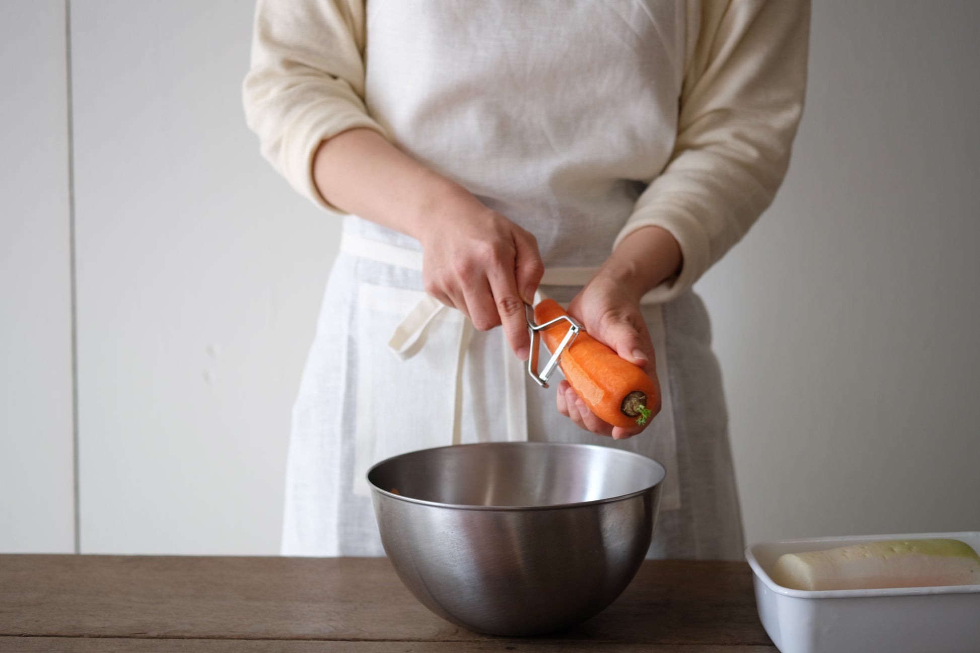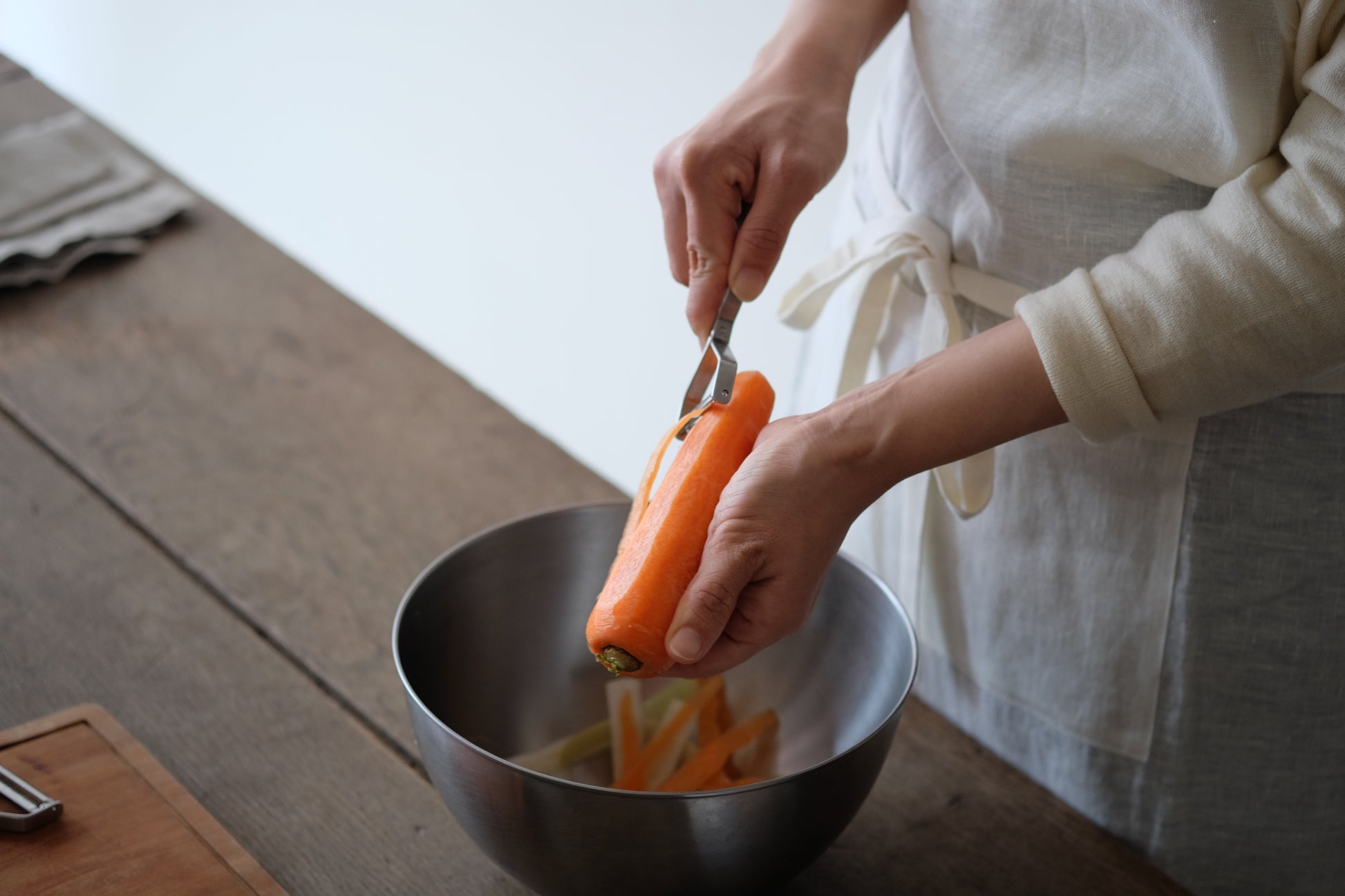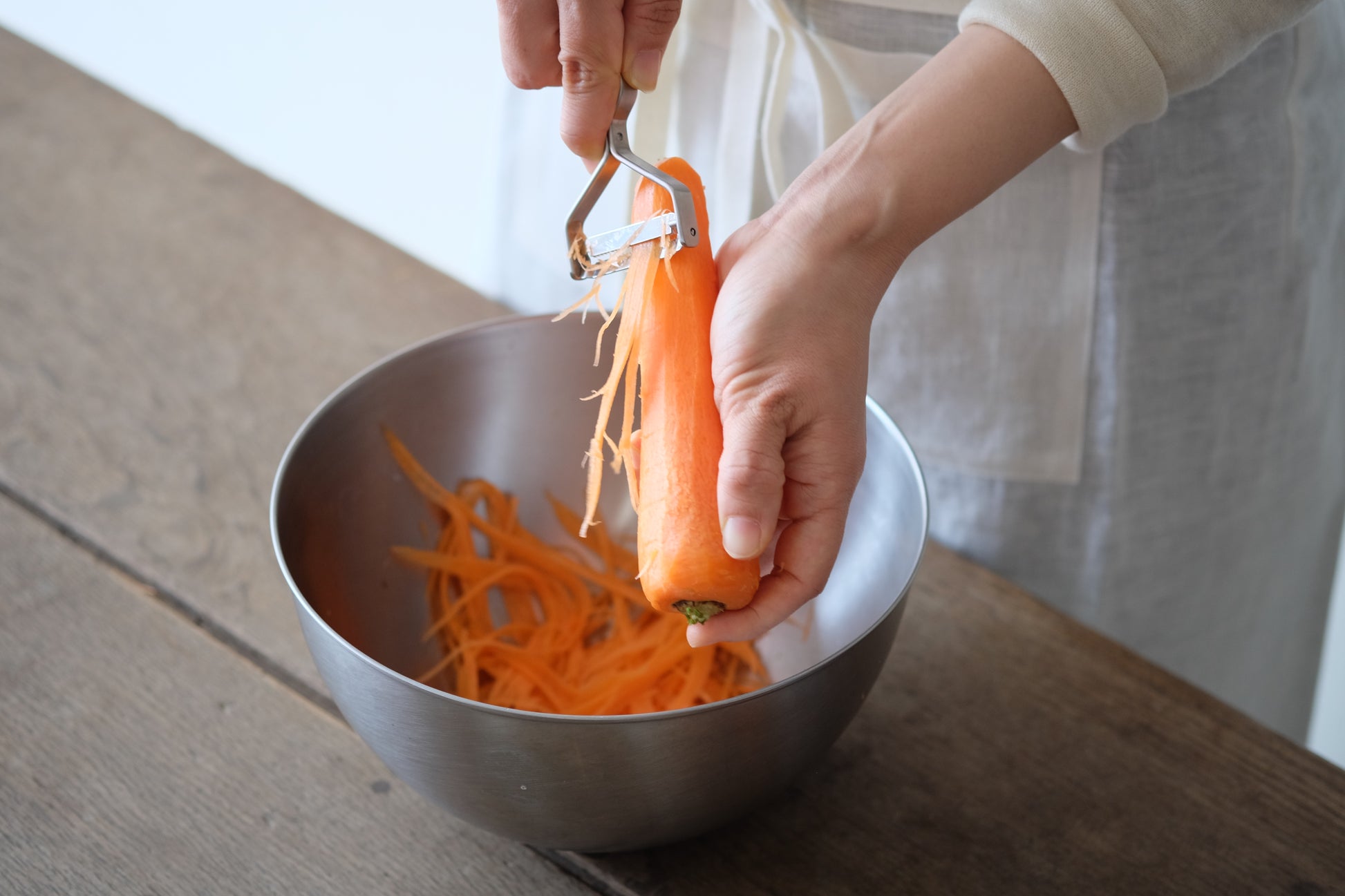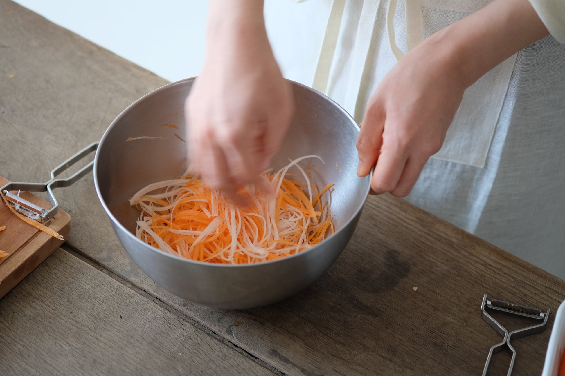 料理の年月を重ねるほど、結局、包丁のほうがラクで……となりがちなキッチン道具。けれど、このピーラーはそのハードルさえも越えて、副菜づくりの手間を軽減してくれるのです。▲左から、ピーラー、千切りピーラー、細千切りピーラー