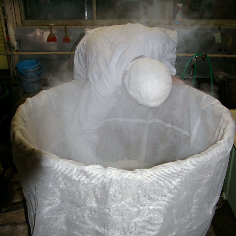 まず大きな木桶で1時間かけて米を蒸したあと、糀室(こうじむろ。糀を発酵させるための部屋)へ。