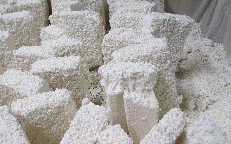 ▲出来上がった糀は、真っ白で固くゴリゴリしているそう。うす暗い糀室の中で糀が美しく輝き、まろやかで甘酸っぱい匂いが漂います