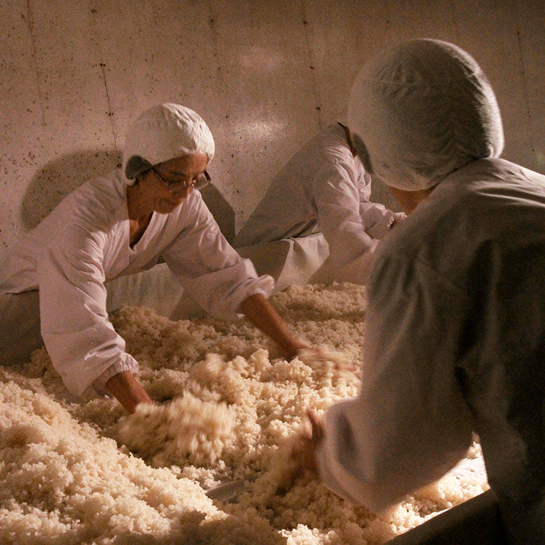 蒸した米は35度くらいまで冷ましたのち、6人くらいで糀菌(種糀)をふりかけて、手でかきまぜたり、転がしたり、揉んだりしていきます。
