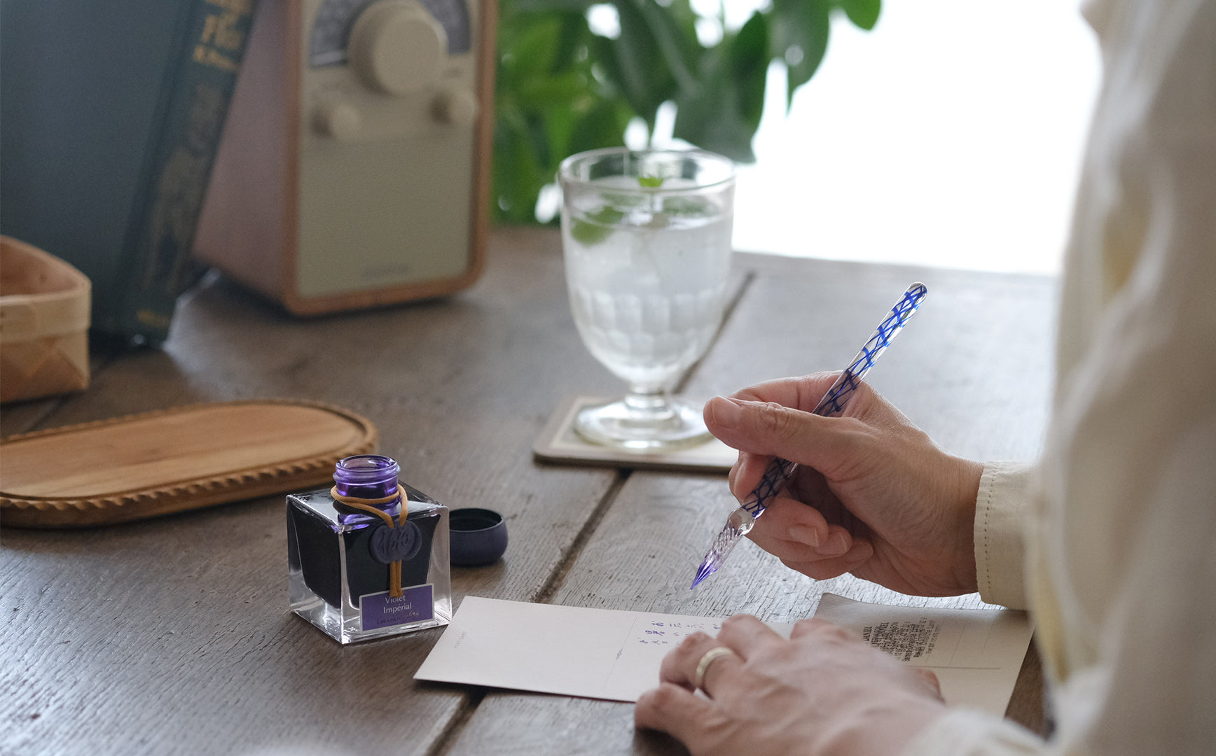 快適な書き心地と印象的な文字、そのふたつが同時にかなう美しい筆記具であるガラスペン。筆跡だけでなく筆圧やインクの選び方にもその人らしさが表れるから、もらう側にも温度が伝わるようなあたたかさも魅力です。