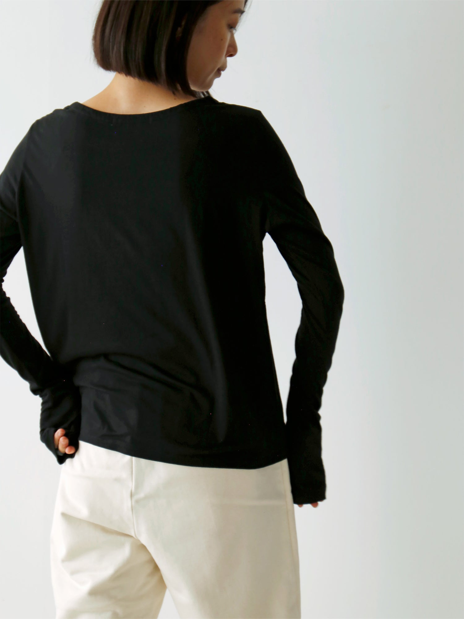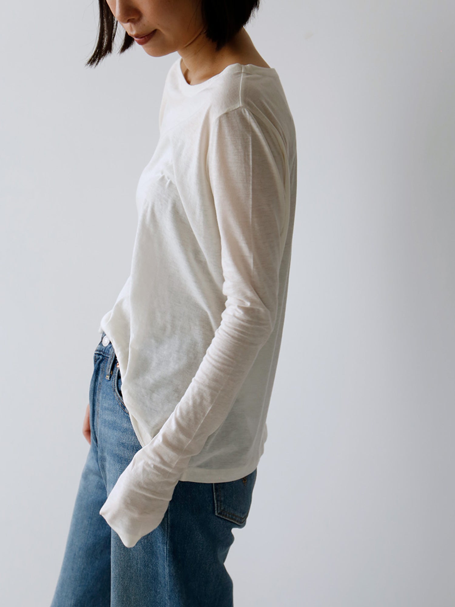身幅は十分にゆったりしているのに対し、袖幅は細く肌にぴたっと吸いつくよう。