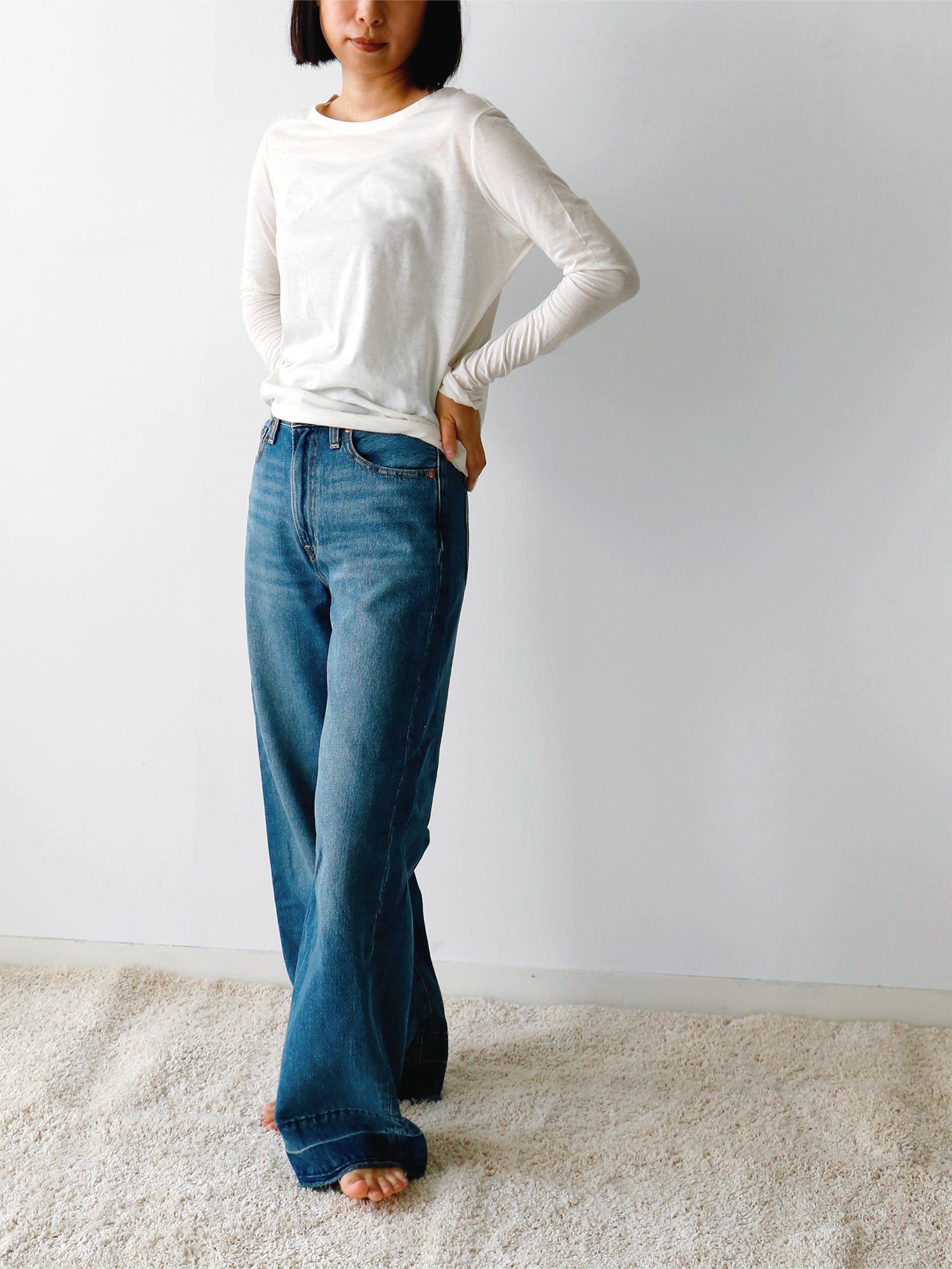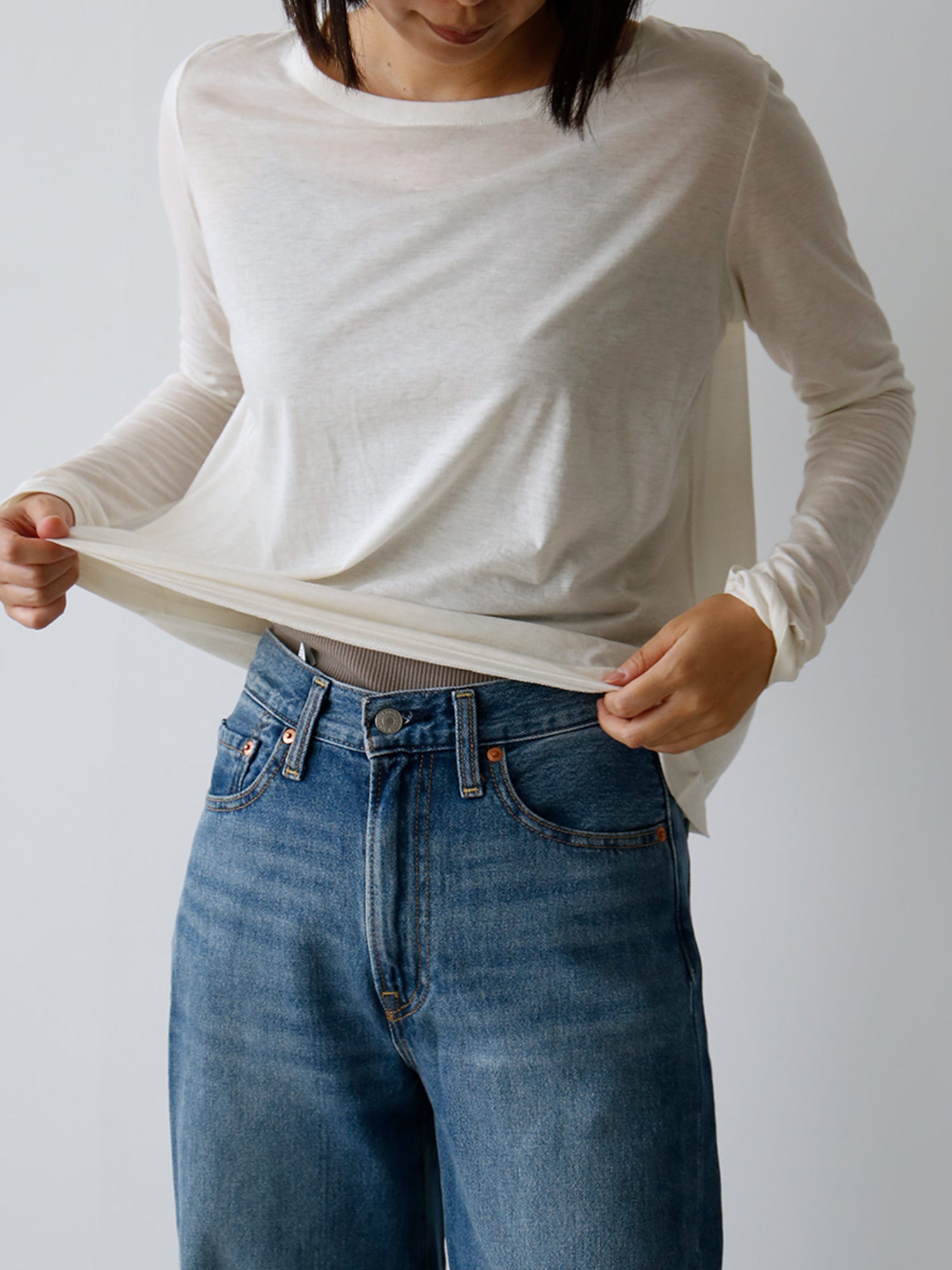 着丈はヒップにかかる程度のベーシックな長さで、袖丈12分丈。伸ばして着たり、くしゅくしゅとしたテクスチャを楽しんでも。