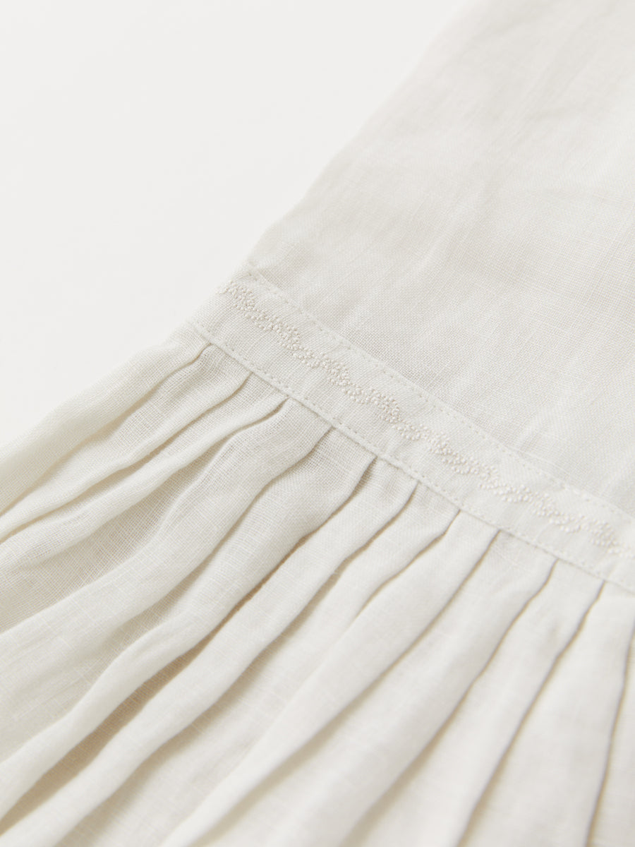膝下の切り替えに刺繍を走らせ、広幅のプリーツがフリルのように付いています。