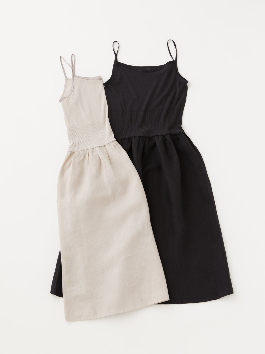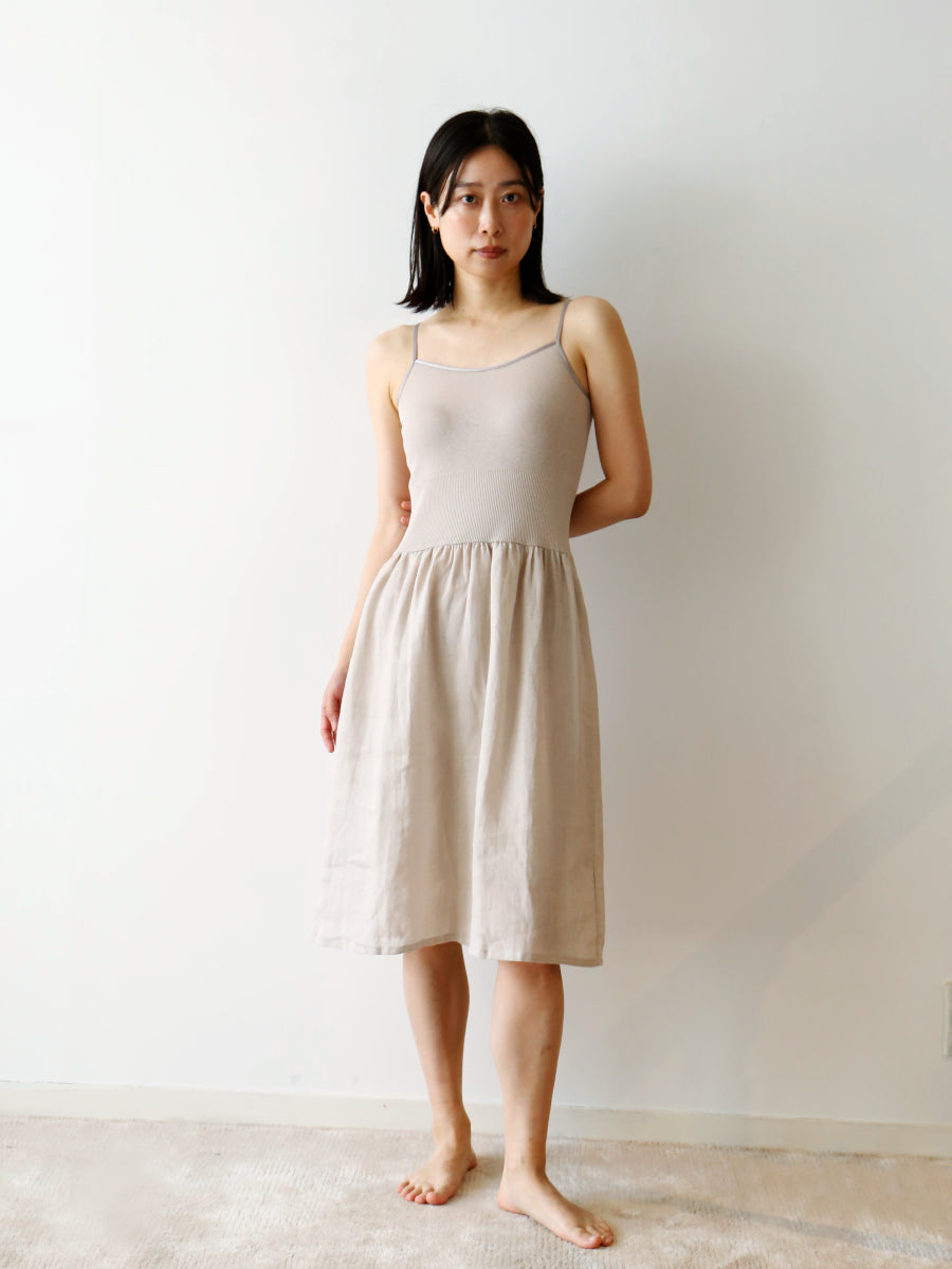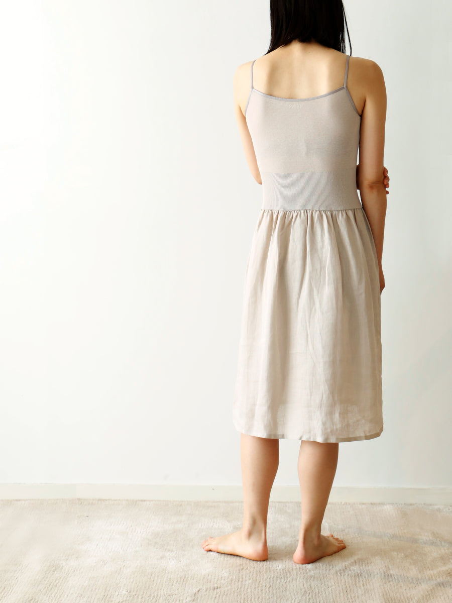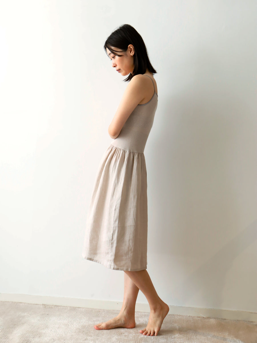 コットンリネンジャージーとリネンスカートのキャミソールワンピース。