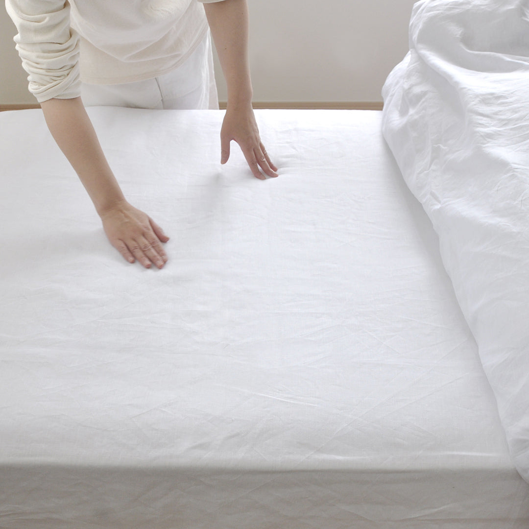 フラットシーツは贅沢に生地をたっぷり使った一枚仕立て。敷き布団や厚手のマットレスをお使いの方におすすめです。夏は肌掛けに、トップシーツのようなアレンジにも適しています。