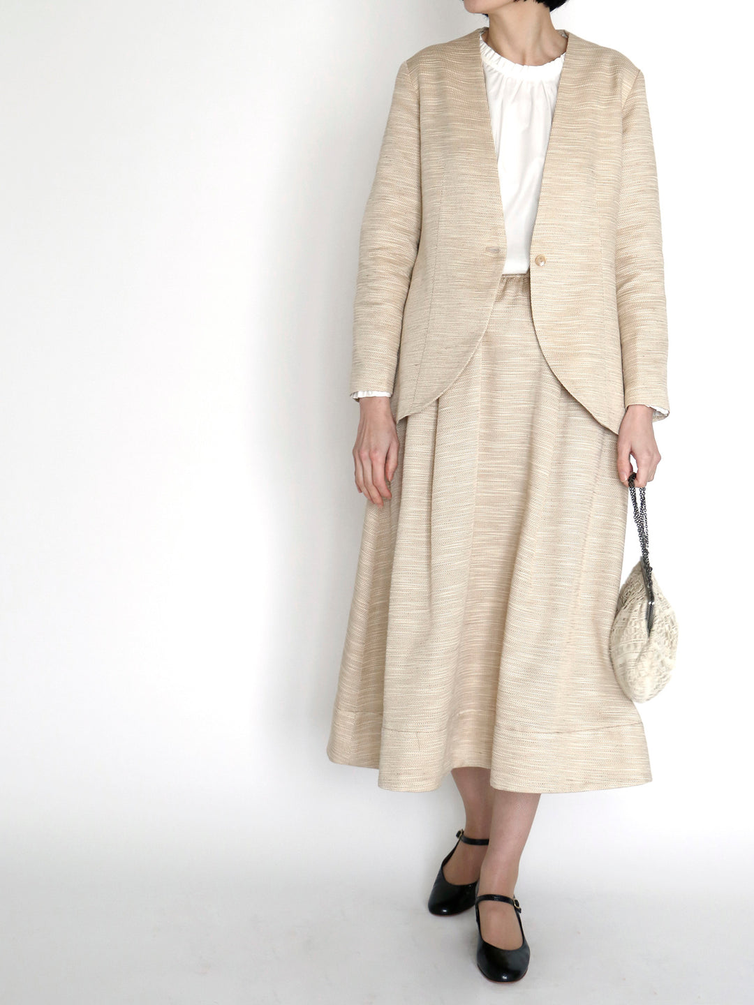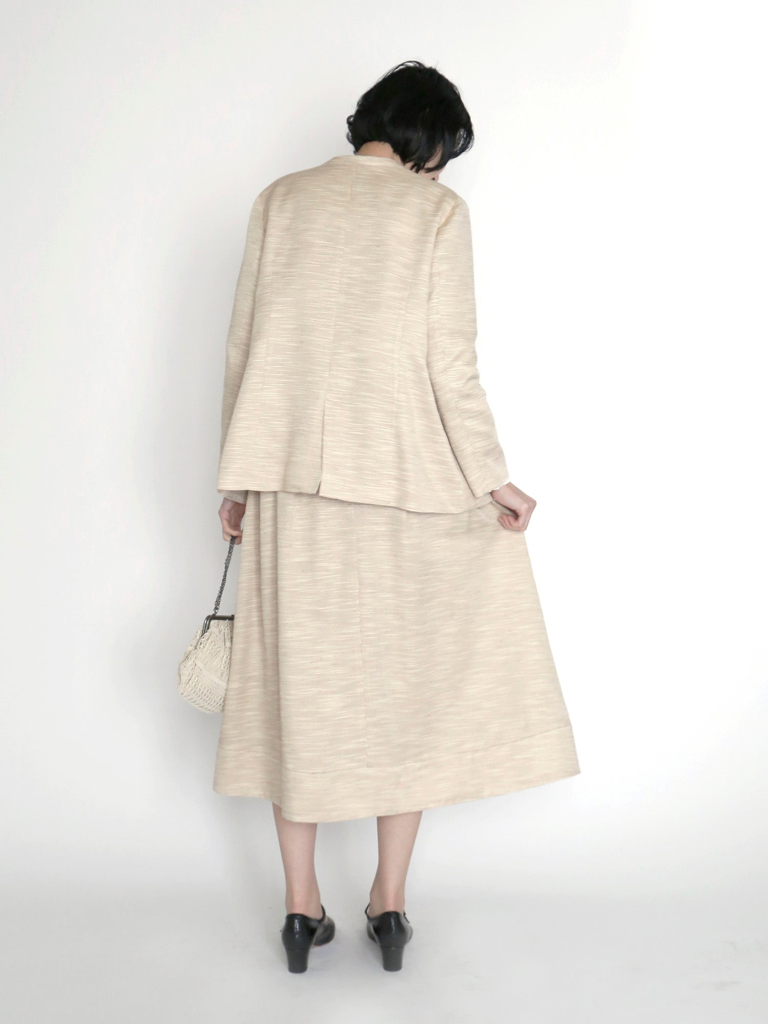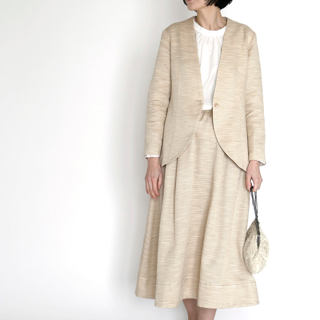 ハレの日だけ着るのはもったいない。今回のセットアップは、きれいめな日常着としてジャケット、スカートそれぞれで着回しが楽しめます。