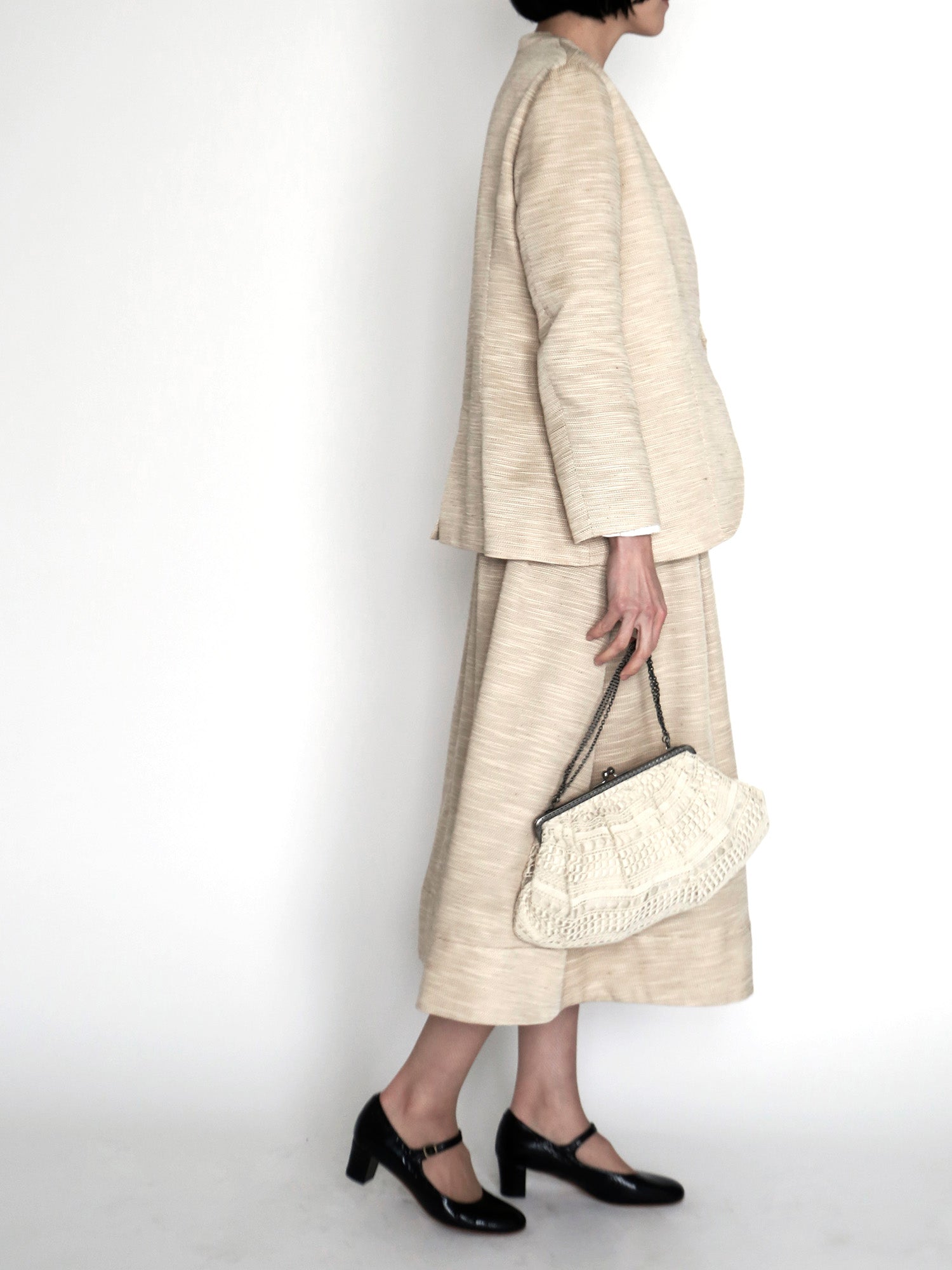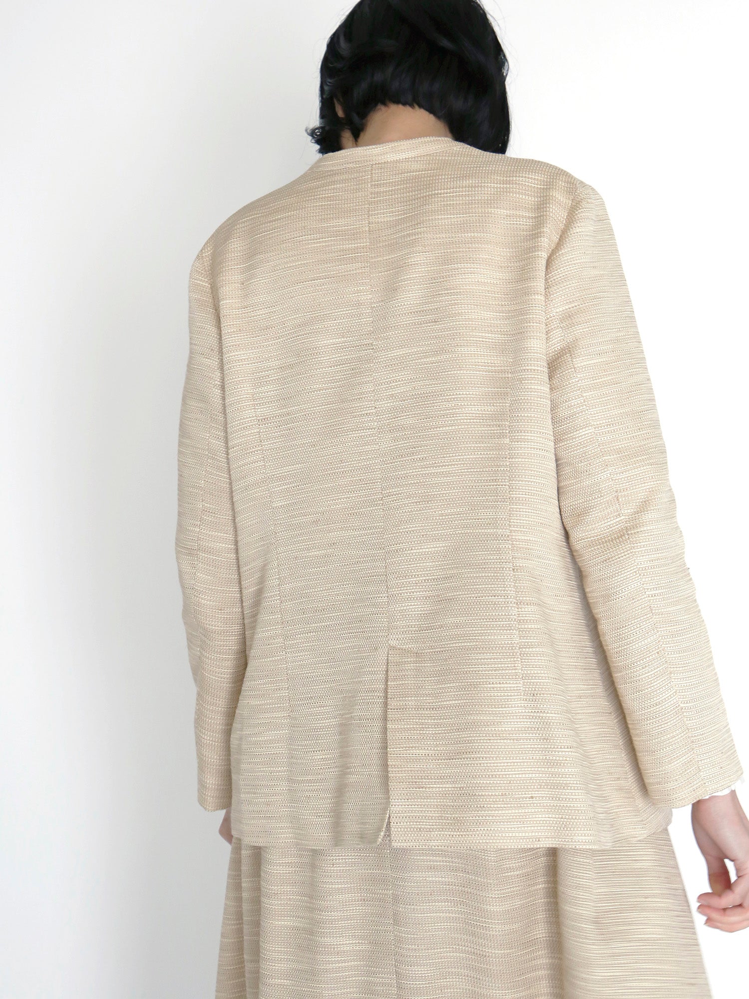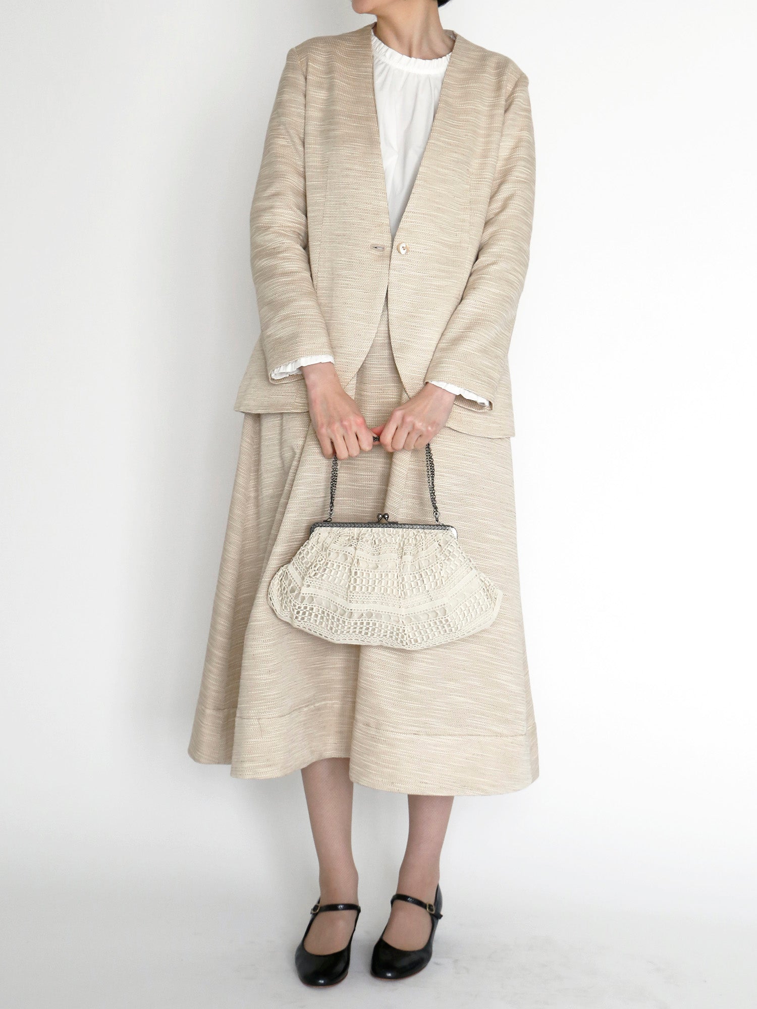 ハレの日だけ着るのはもったいない。今回のセットアップは、きれいめな日常着としてジャケット、スカートそれぞれで着回しが楽しめます。