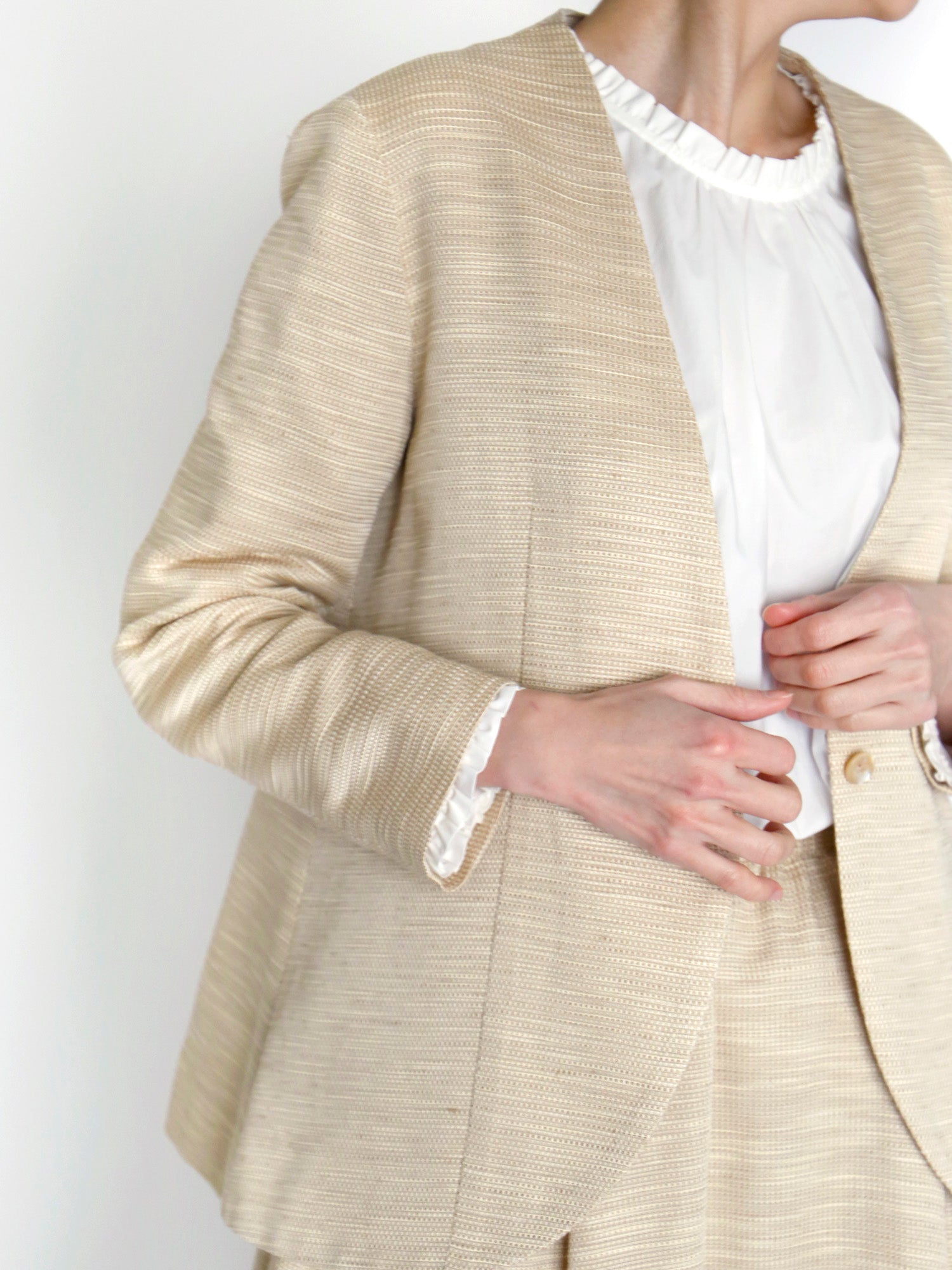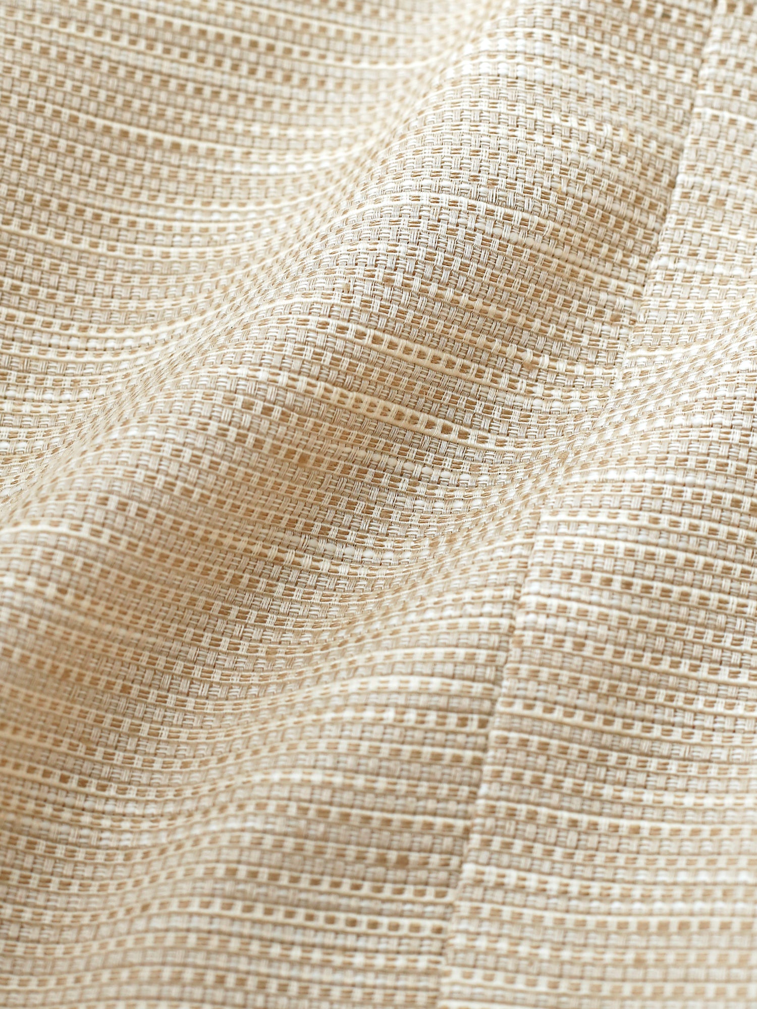 上品で立体感のある織りが特徴的な生地は、イタリア製のコットンリネン。ナチュラルなベージュの色合いと、繊細な凹凸のあるテクスチャーが、シンプルながらもリッチな雰囲気を生み出しています。