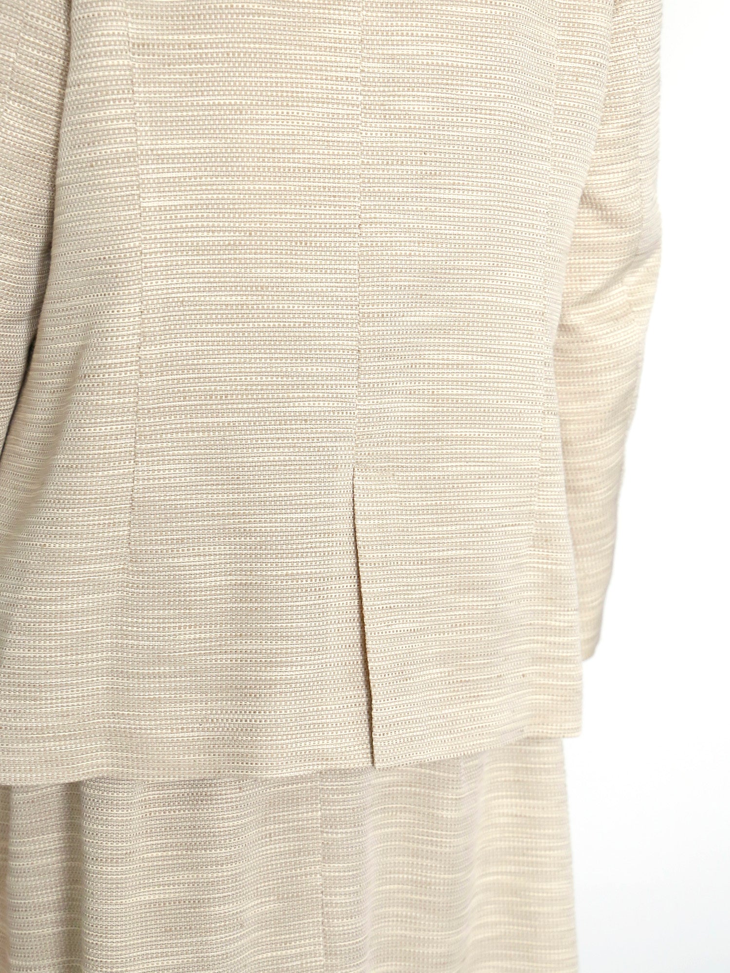 シンプルなデザインだからこそ、光によって際立つ織りの陰影が美しく映えます。規則的な織り模様がクラシカルで落ち着いた印象を与え、より一層エレガントな一着に仕上がっています。