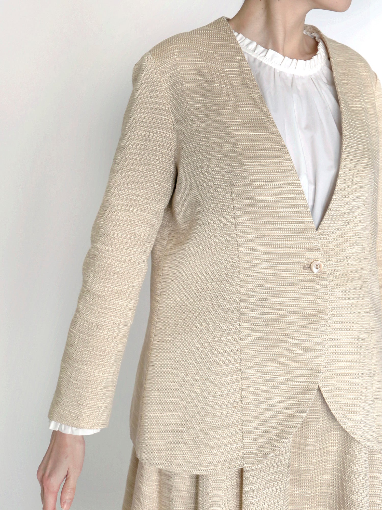 ノーカラーのすっきりとした襟元から続く、女性らしい曲線が美しいシンプルでミニマルなデザイン。控えめでありながらも、洗練された雰囲気を感じさせるのは、上質な生地で仕立てているから。