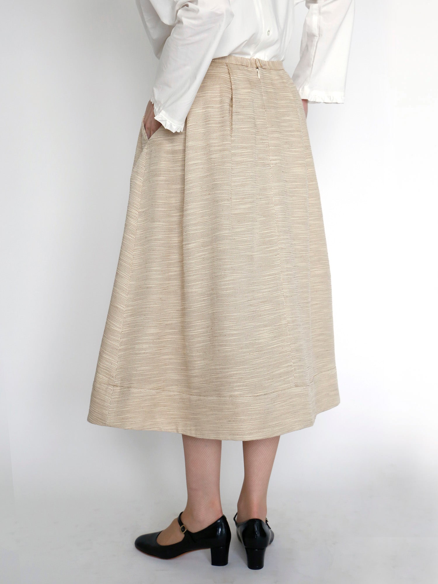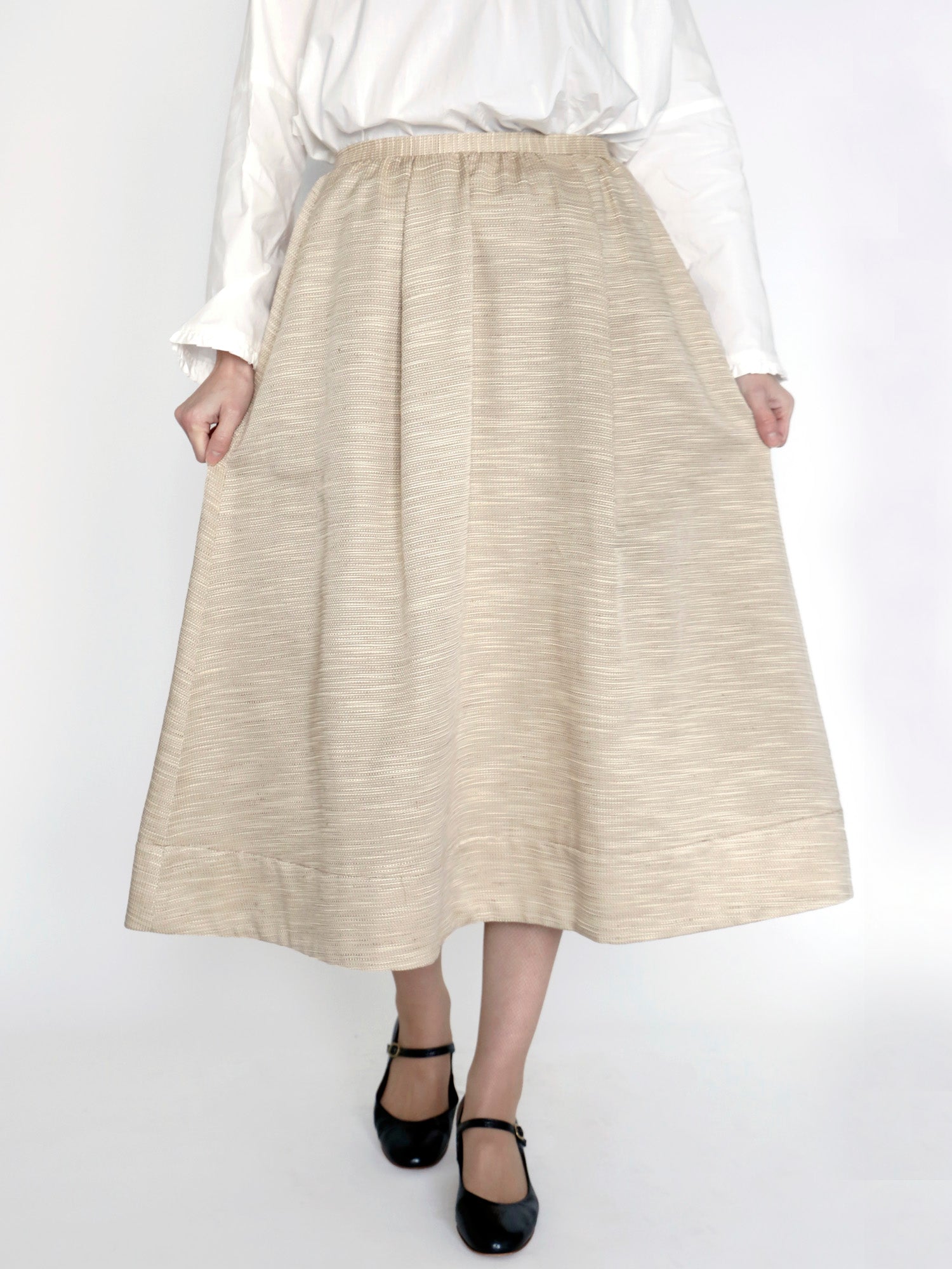 ウエストにタックとギャザーを寄せ、ドレープが優雅に揺れるフレアスカート。身体のラインを拾いにくい程よい厚みのある生地は、柔らかく馴染みながら、自然な落ち感と上品なシルエットを演出します。