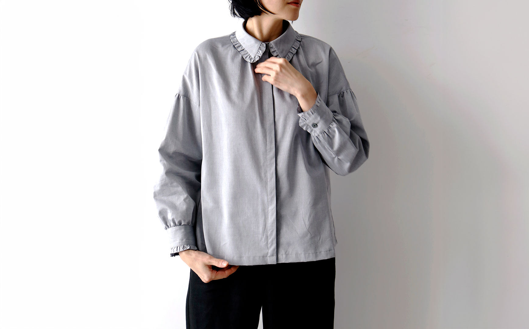 控えめなピコフリルカラーのブラウスを、これからの季節のコーディネートにどうぞ。