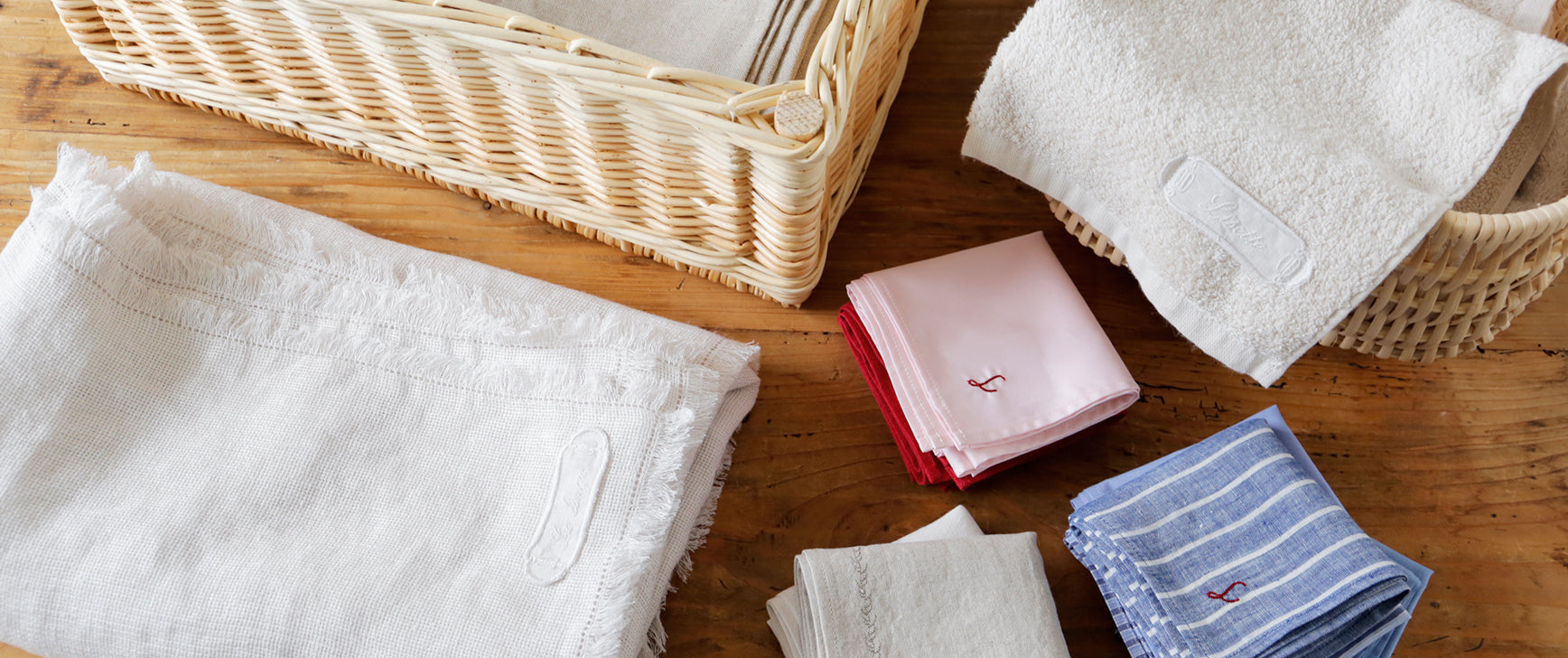 リゼッタがずっとつくり続けている、「L」の刺繍が入ったムショア・リゼッタが新入荷。