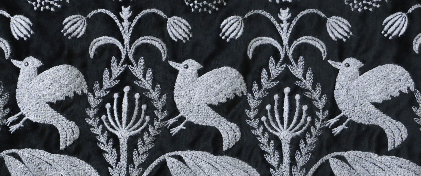 リゼッタがこのアイテムのために描き起こした鳥と植物の刺繍を、