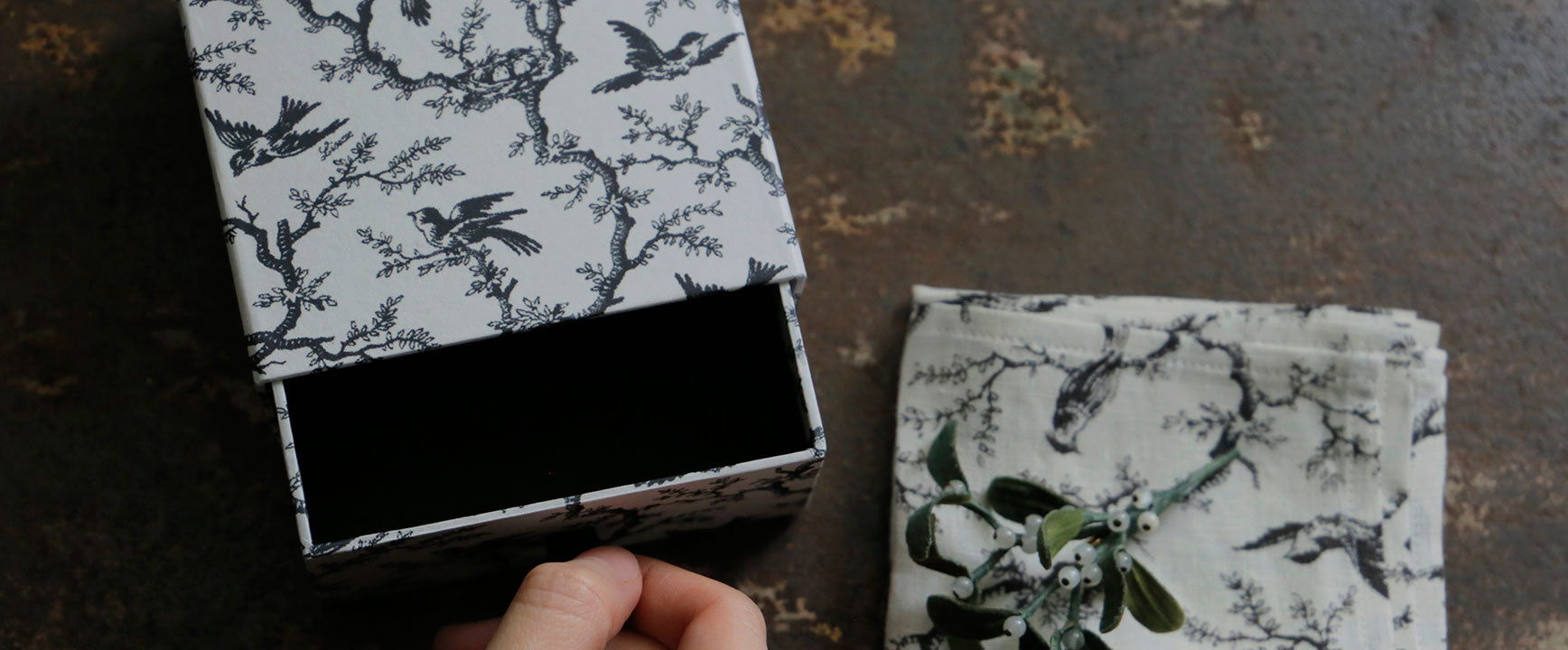 小箱「ティロワール・ロアゾ」にロアゾ柄のハンカチとヤドリギのコサージュを収めたクリスマスコフレ。