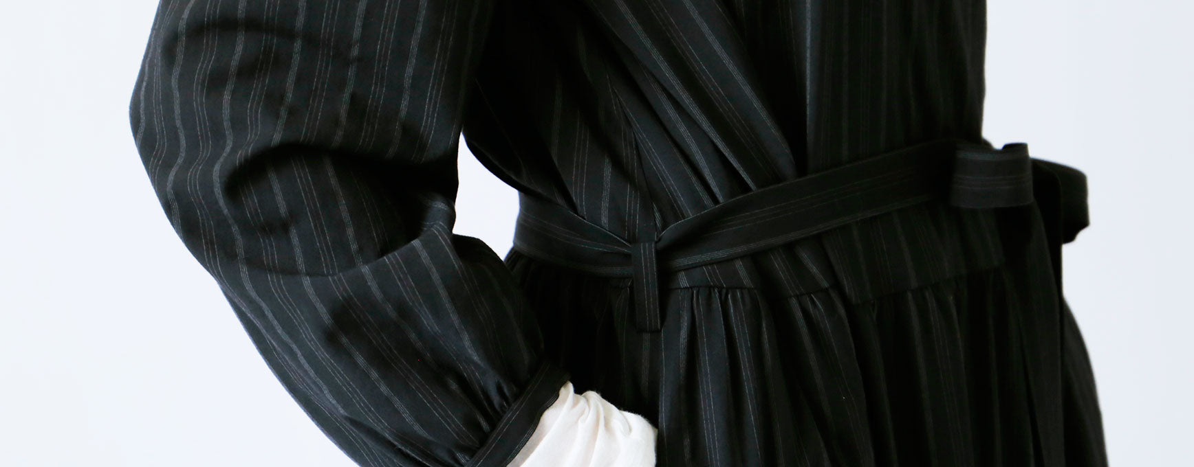イタリア Faliero Sarti社のメンズライクなピンストライプの生地で、パンツ、スカート、カシュクールワンピースの3型の服を仕立てました。