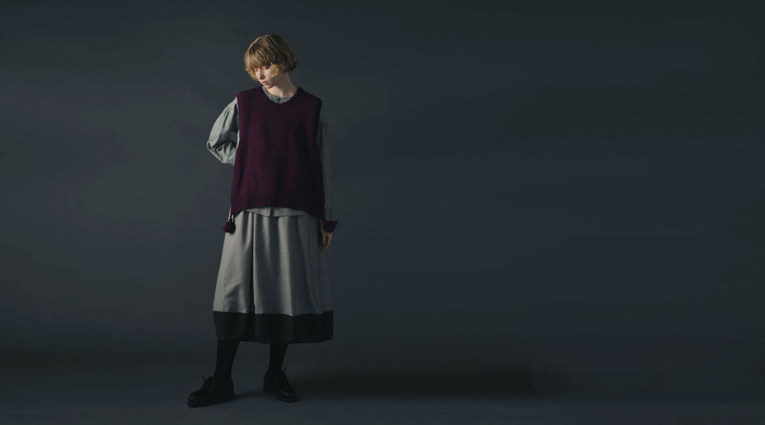 スカート《モルガン》は、全体のシルエットは円錐状で、別布がすり鉢状になるように接ぎあわせた立体的なバルーン。ウエストは細かくタックを取ったゴム仕様で履きやすく。シンプルでも動くたび印象的な表情が楽しめます。