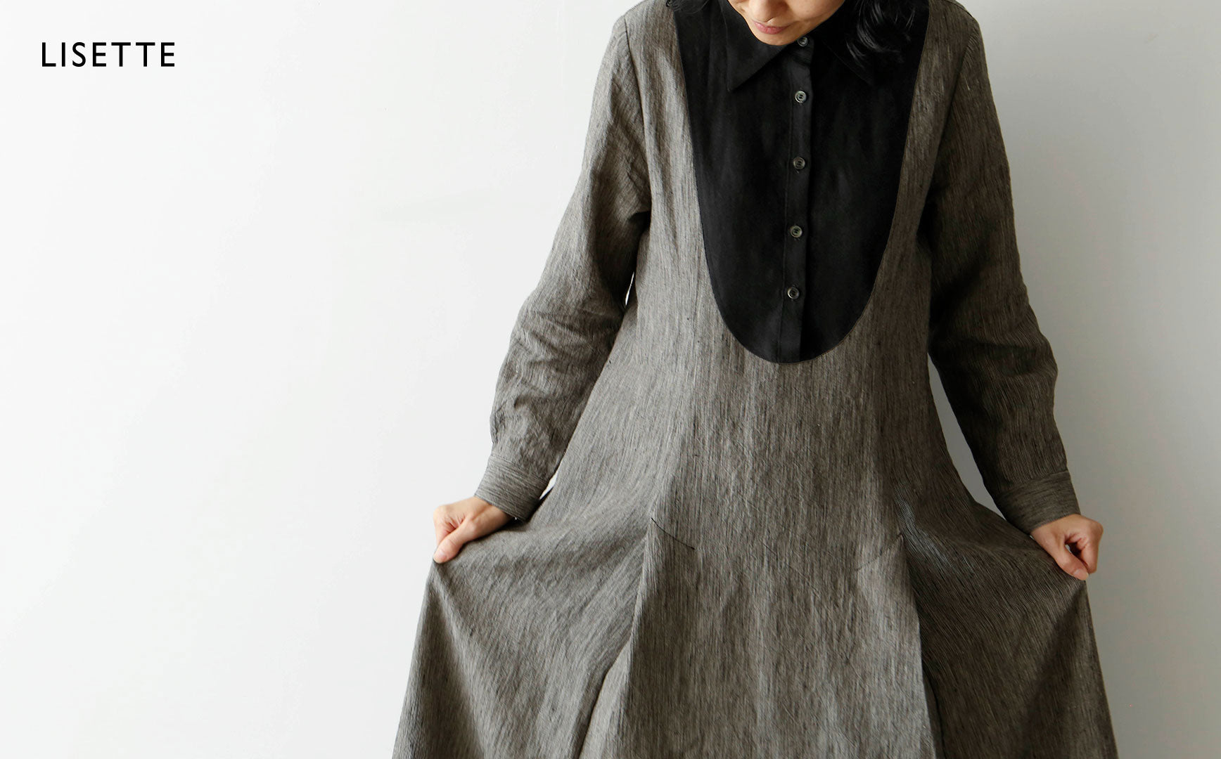 素材はリネンの最高峰アイリッシュリネン。繊維が細い上質な糸で織られた、繊細なストライプが上品です。ヨークと襟には黒色のリネンを配色した大人っぽいデザイン。襟が付いているのでジャケットを羽織ったお出かけスタイルにも。