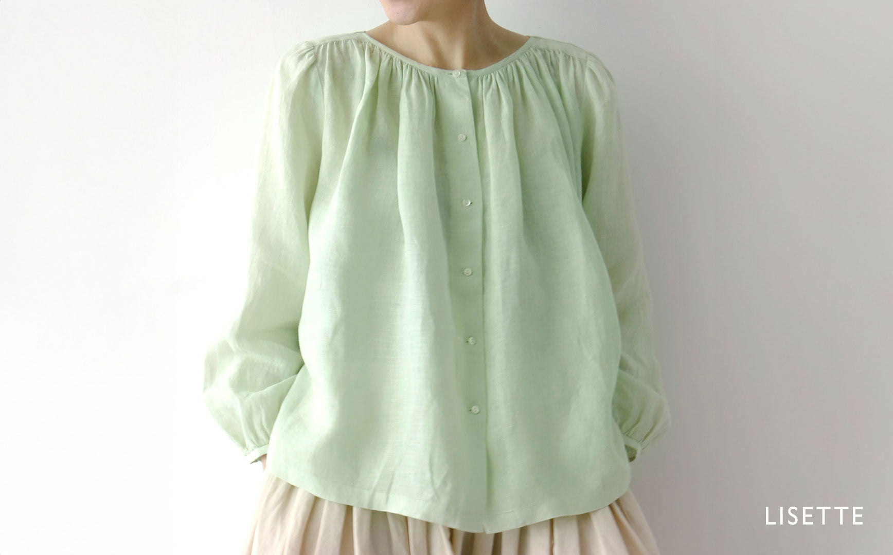 薄手のやわらかなリネンで仕立てたギャザーブラウス。やわらかくふわりとしたシルエットで、どんなアイテムとあわせても、女性らしいやさしい雰囲気のコーディネートにまとめてくれます。