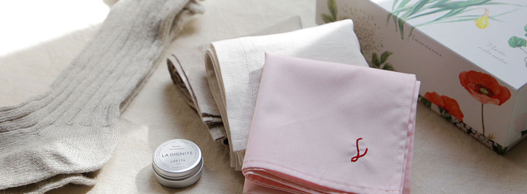 花束やお菓子に添える、小さなプレゼントにぴったり。リネンや華やかなオリジナルプリントのハンカチが充実しています。