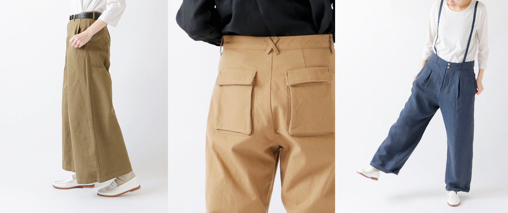 さらりと一枚で履ける薄手素材のパンツから、通年履ける厚手のものまで。