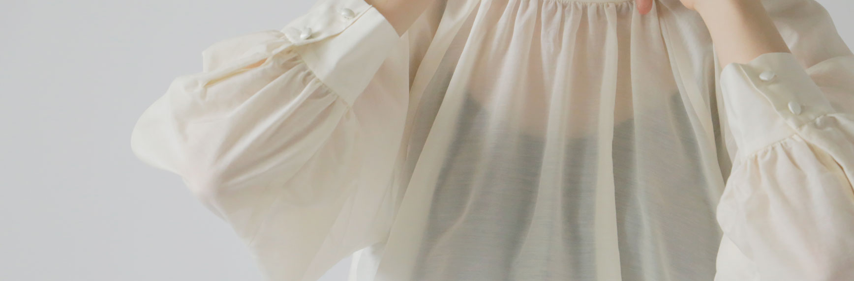 存在感のあるスタンドカラー、袖口に2つ並んだシルクのくるみボタン。小さなアクセントがたくさん詰まった1着。たっぷりと寄せたギャザーからのドレープも美しいです。