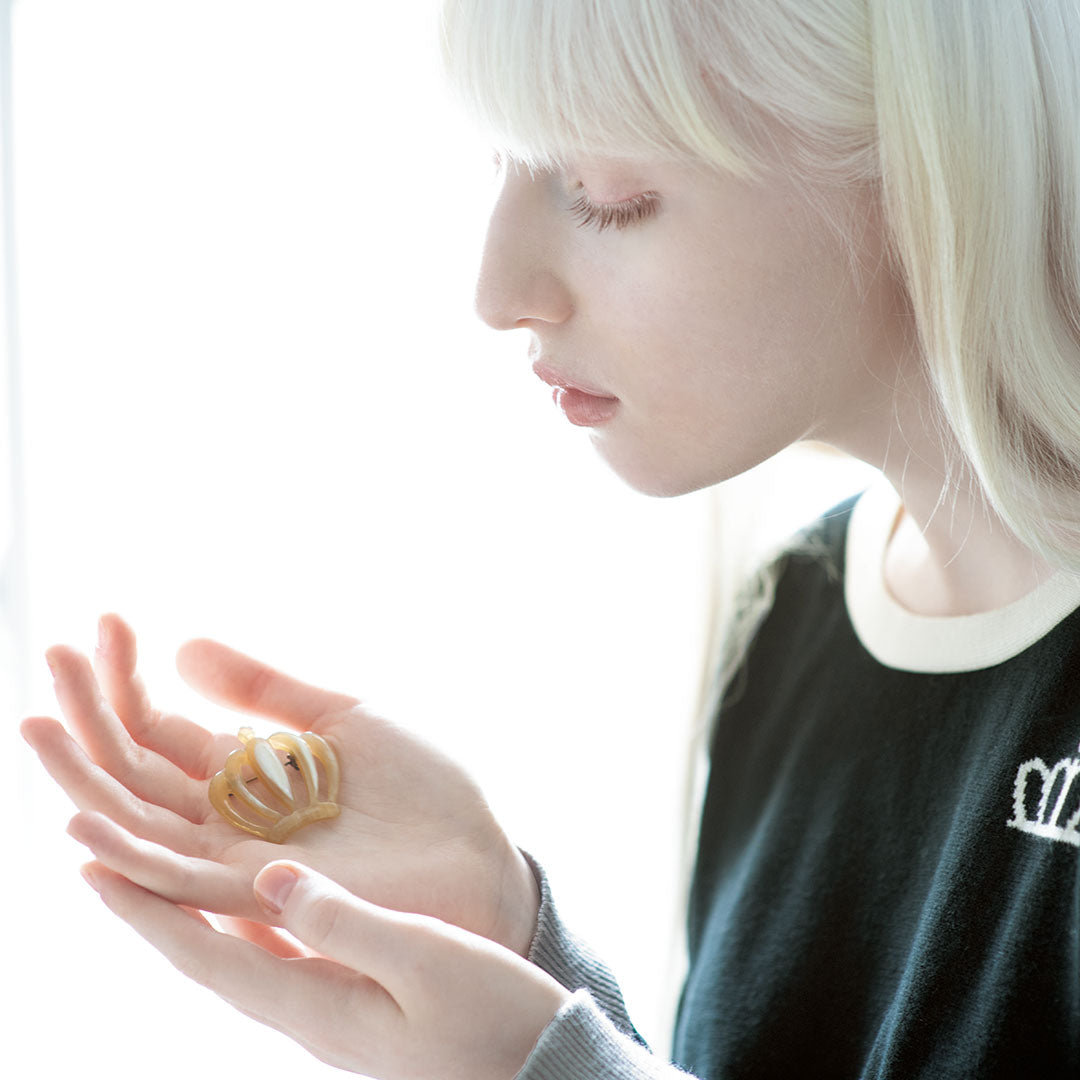 王冠をモチーフにした水牛の角のブローチ。