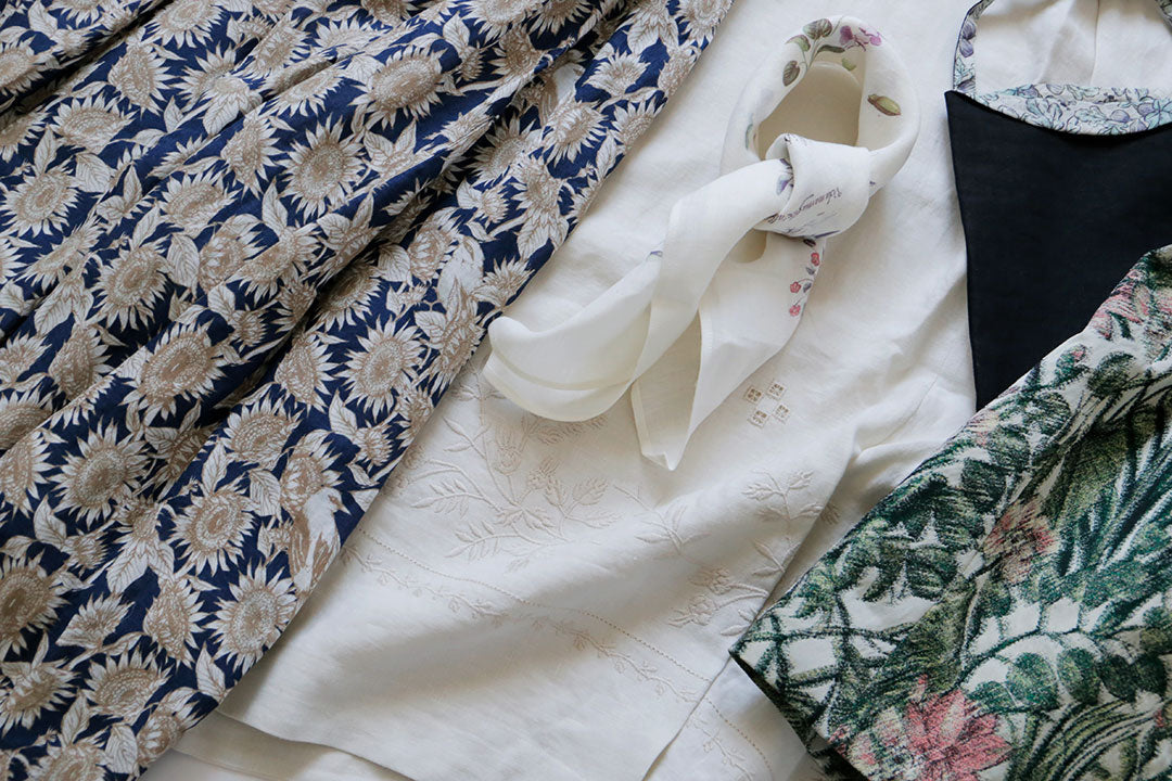 オリジナルのバラの実を描いた刺繍やひまわり畑をイメージしたテキスタイル、絵画のような緑とピンクのボタニカル柄・・・