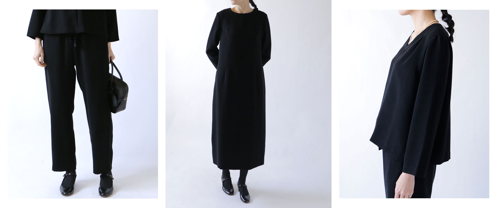 漆黒のポリエステル地で仕立てたワンピース・ブラウス・パンツ。