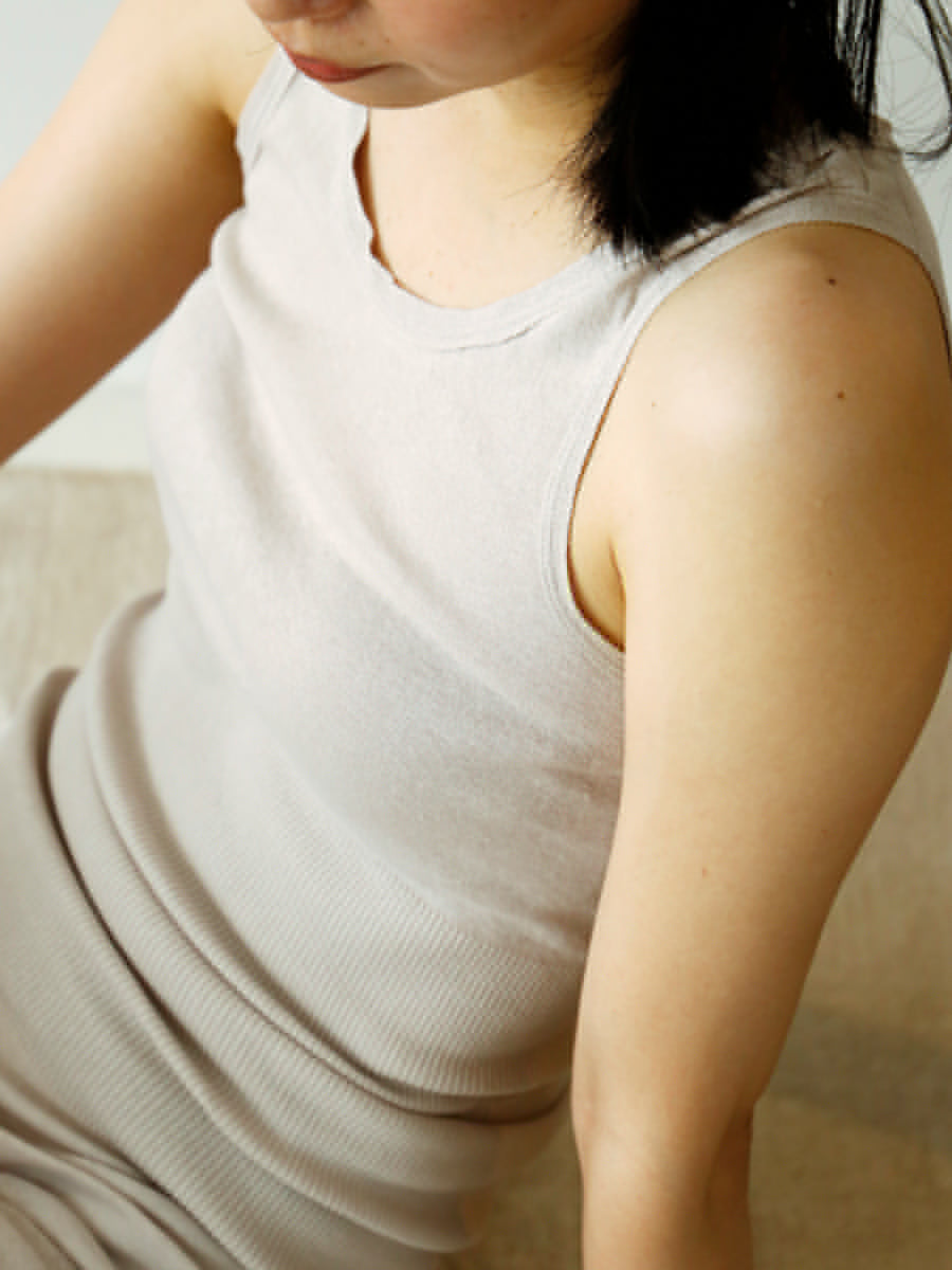 薄着になる季節に、襟ぐりから覗いても気にならない、シンプルなデザインです。