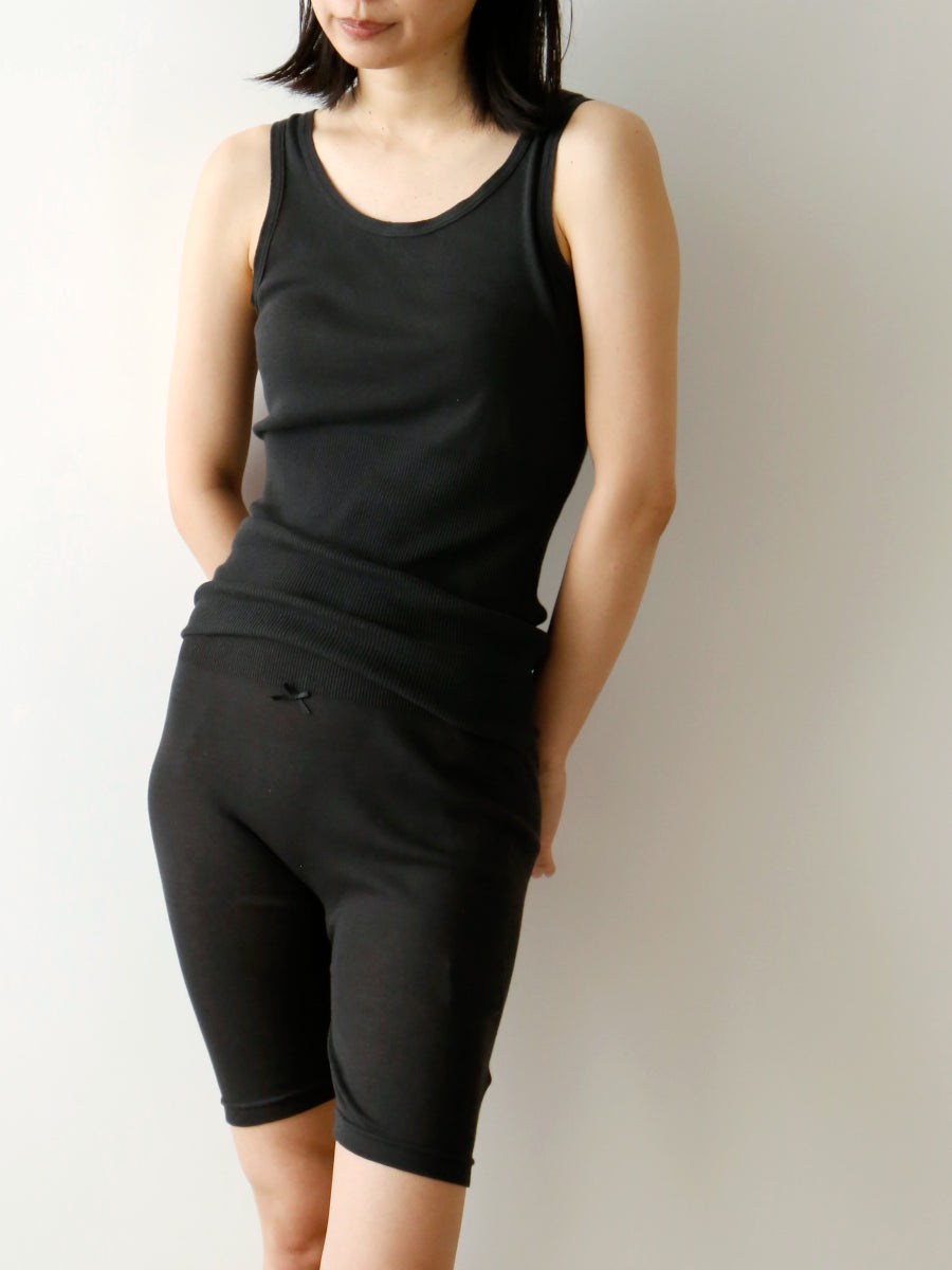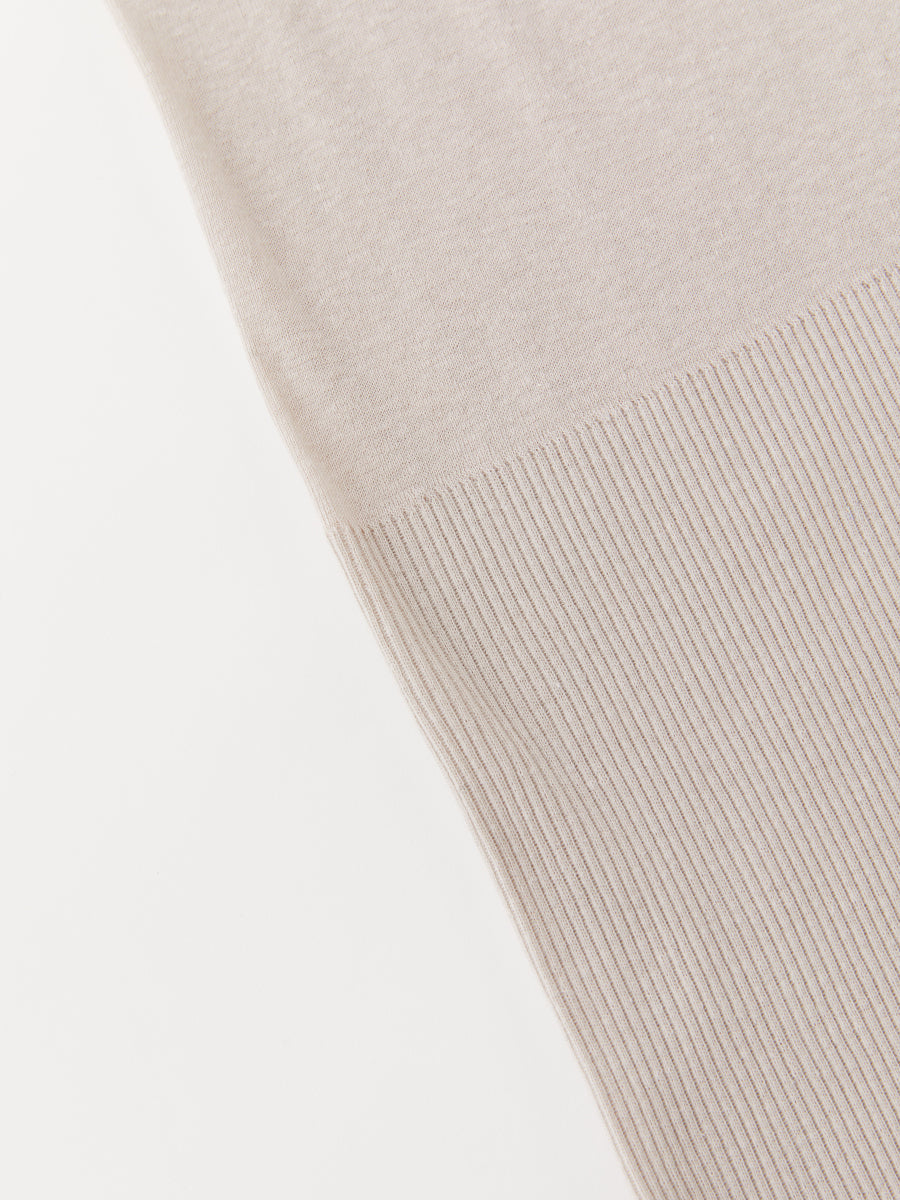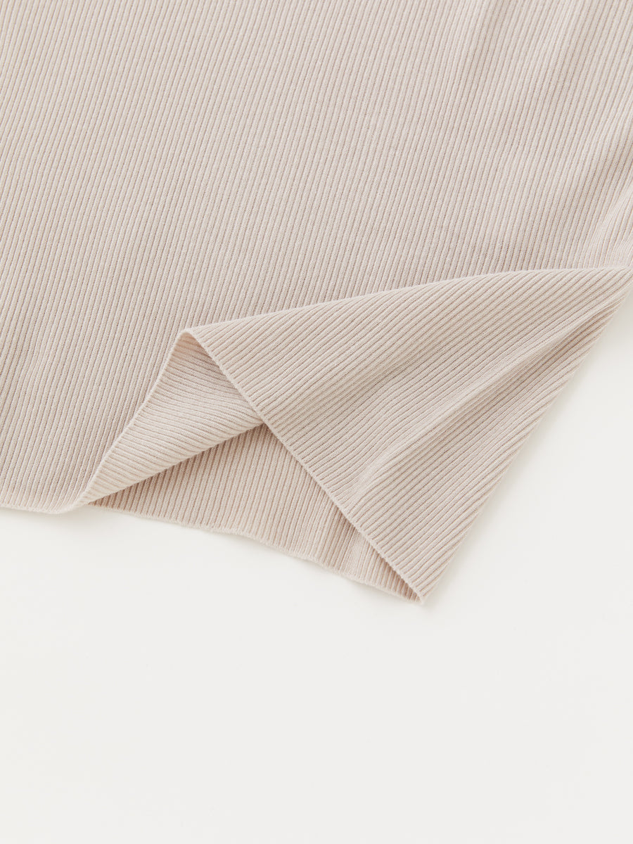 筒状に編まれていて、脇や裾に縫い目がありません。バスト部分はメリヤス編み、胸下から裾まではリブ編みが心地よく身体にフィットします。