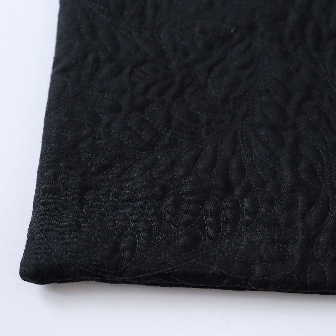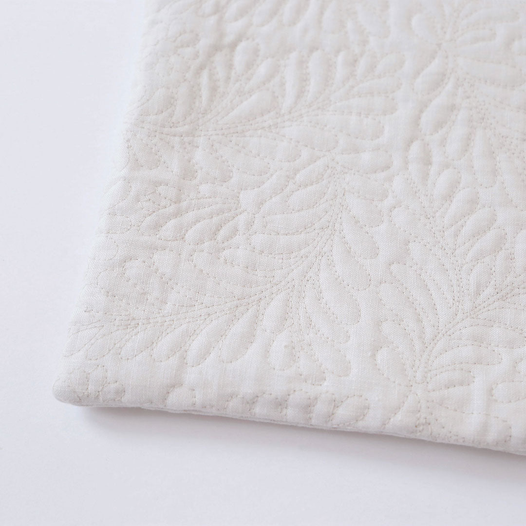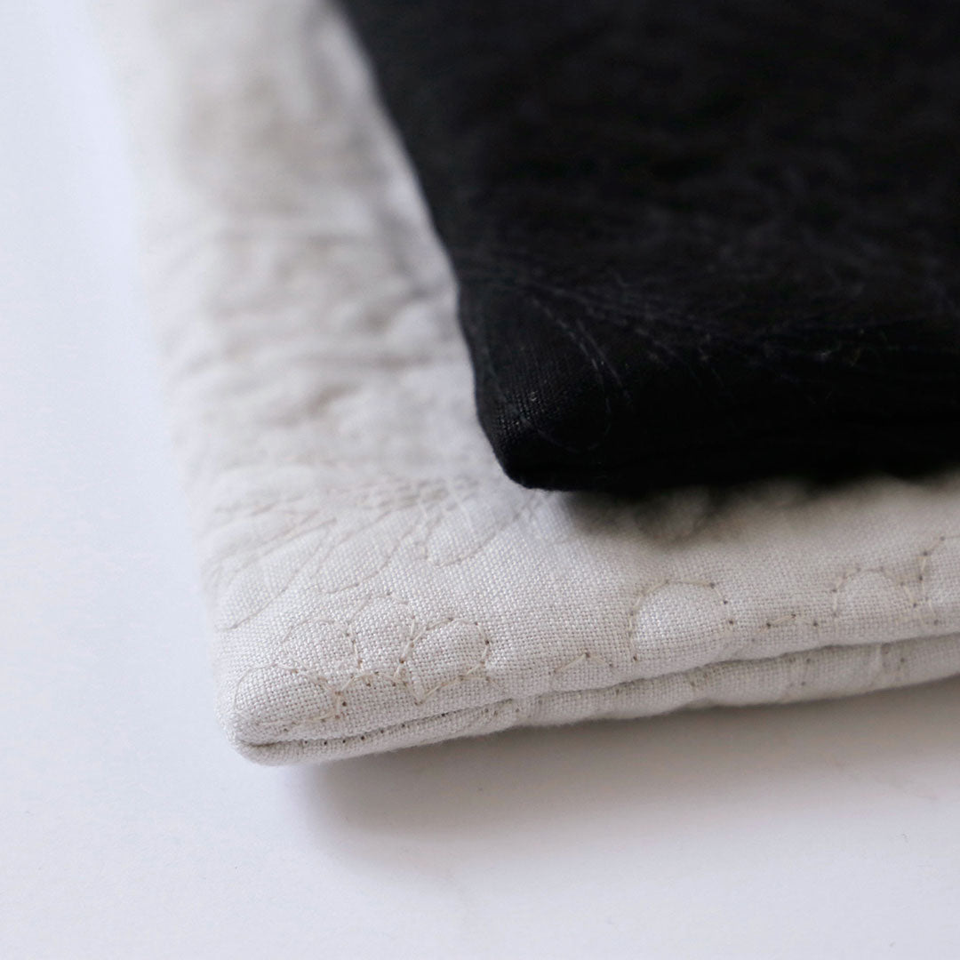 リネン2枚の間に綿を抱かせ、キルトミシンで図柄を描き出しました。目を凝らすと全面に美しい植物柄が浮かび上がります。