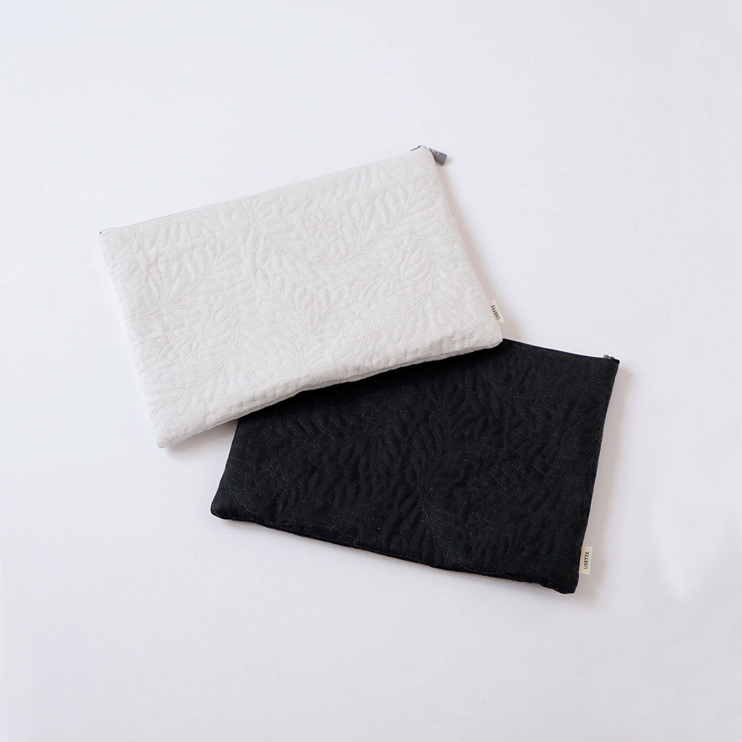 南フランスの古典的なキルト「ブティ」をイメージした植物柄のキルトでつくった長方形のポーチ。